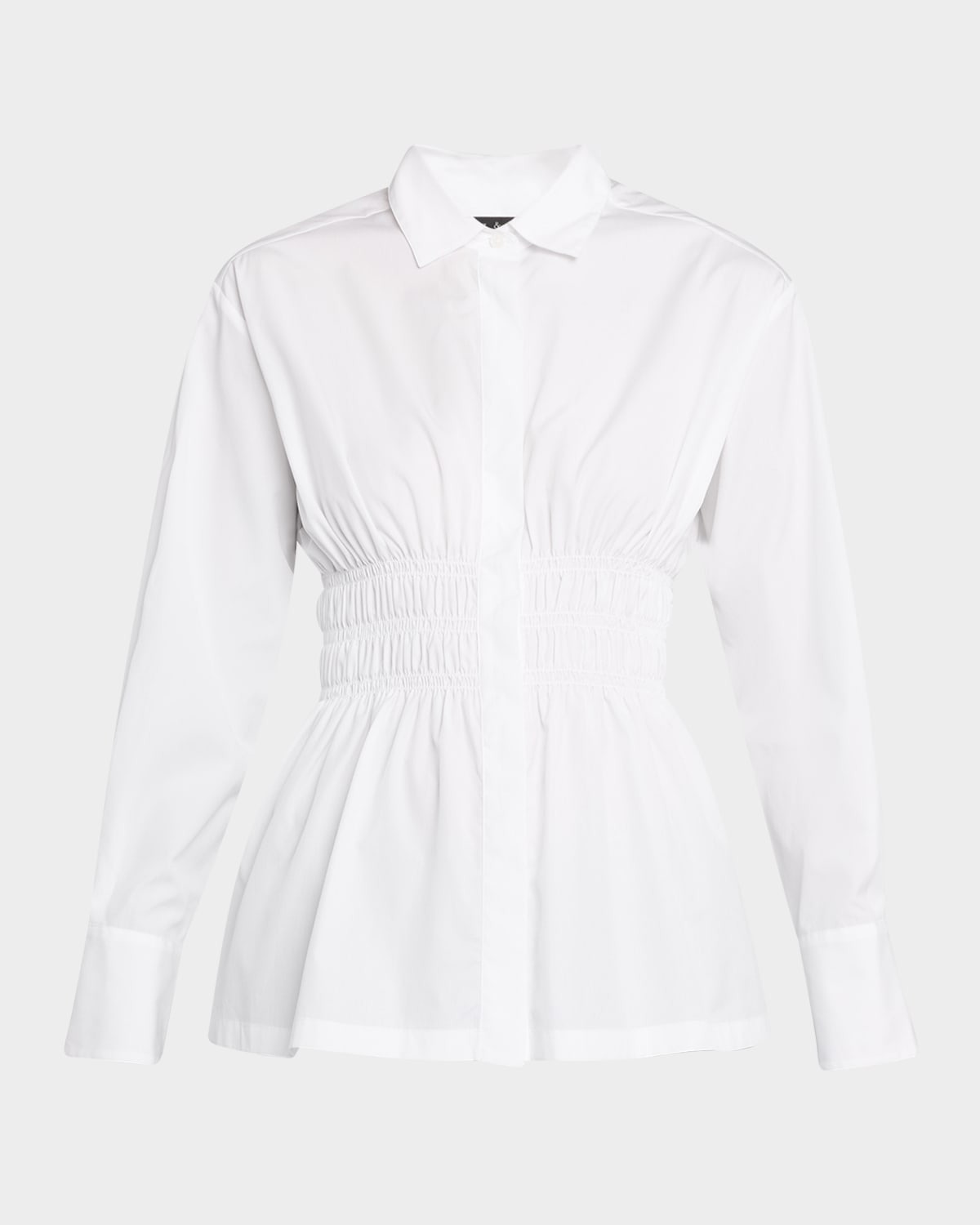 - Rag & Bone "Blythe" crisp cotton poplin shirt with a smocked waist - Point collar - Long sleeves with button cuffs - Classic fit - Hem falls to the hip - Concealed button-front - Cotton - Machine wash warm - Imported