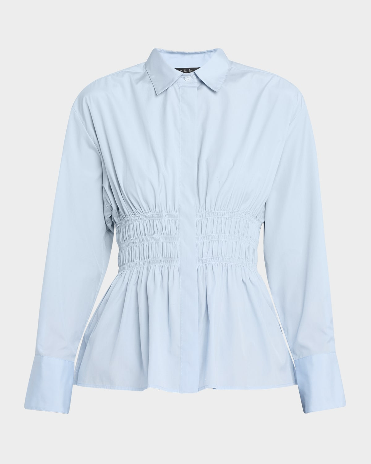 - Rag & Bone "Blythe" crisp cotton poplin shirt with a smocked waist - Point collar - Long sleeves with button cuffs - Classic fit - Hem falls to the hip - Concealed button-front - Cotton - Machine wash warm - Imported