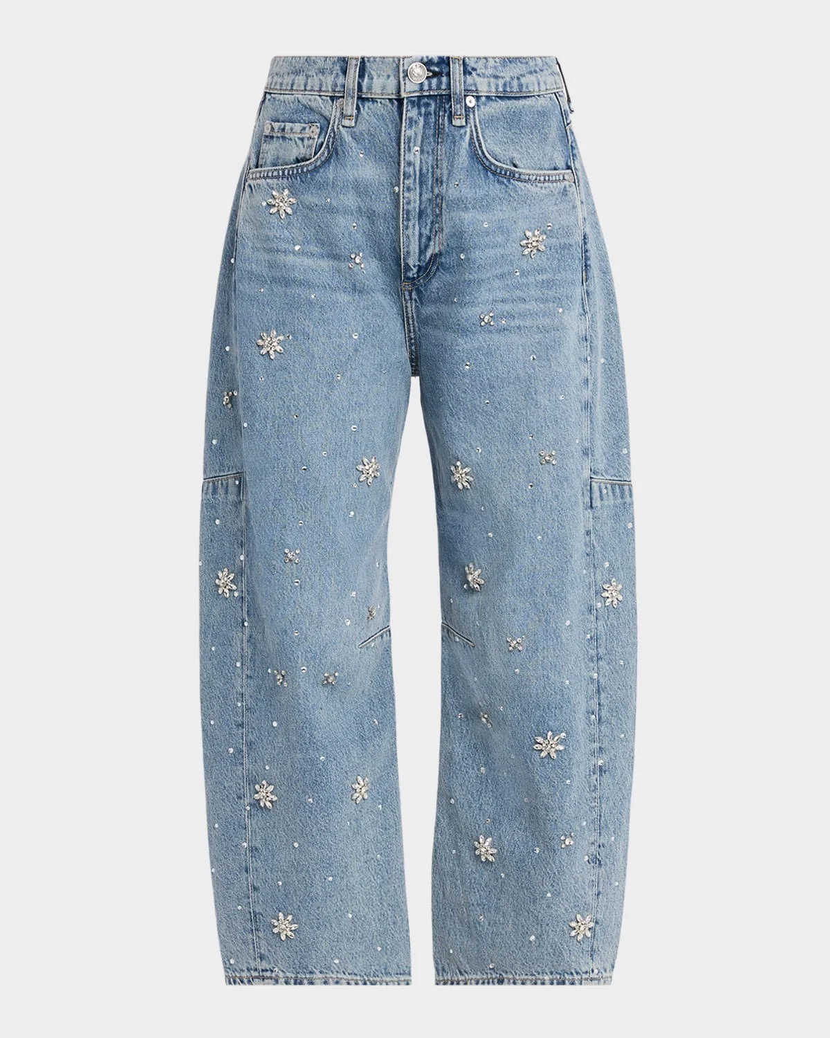 Rag amp; Bone "Charlie" crystalembellished barrel jeans in lightweight rigid denim Approx. 13.3" rise; 25.5" inseam High rise Fivepocket style Relaxed fit Ankle length Button/zip fly; belt loops Cotton Dry clean Imported