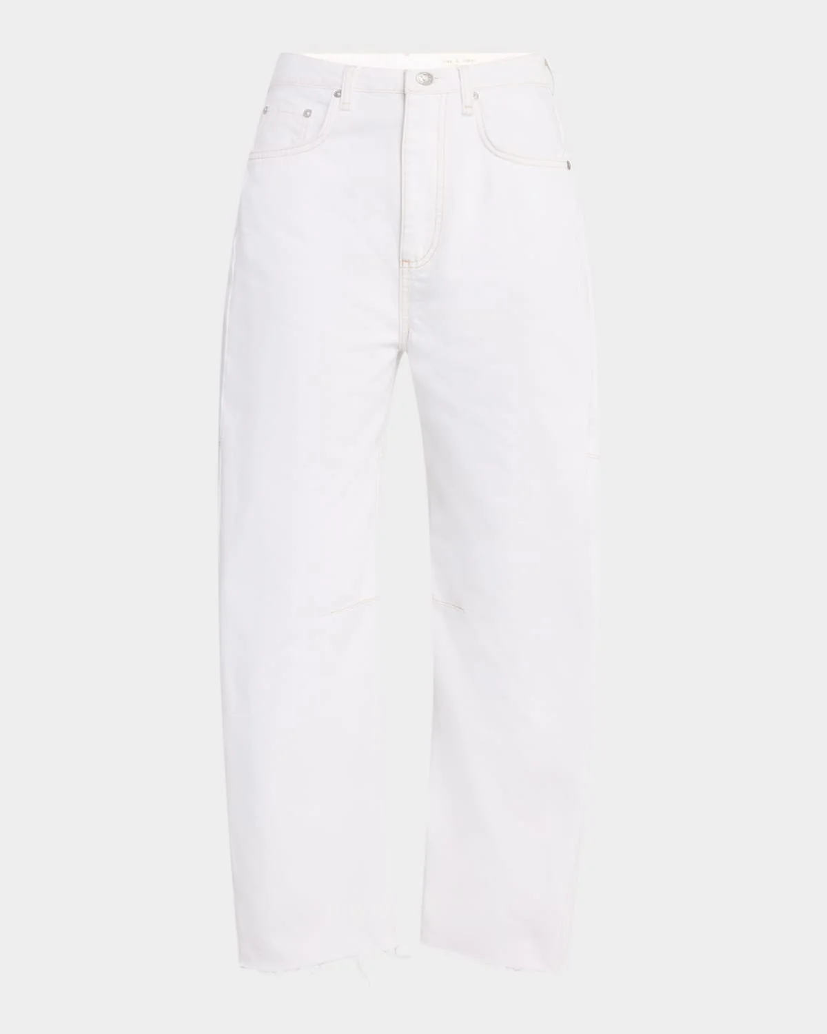 - Rag & Bone "Charlie" barrel jeans featuring a raw hem in crisp white denim - High rise - Five-pocket style - Loose, curved legs - Full length - Button/zip fly; belt loops - Cotton - Machine wash cold - Imported