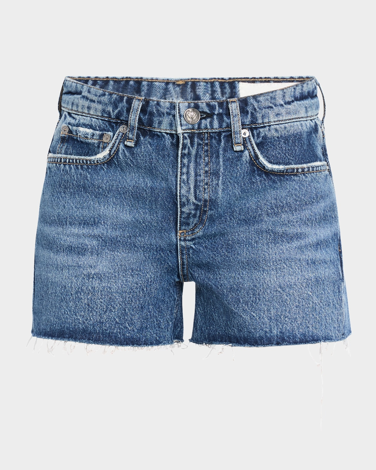 - Rag & Bone "Dre" cut-off shorts in medium-wash denim - Approx. 3.5" inseam - Low-rise; sits at the hip - Five-pocket style - Relaxed fit - Button/zip fly; belt loops - Cotton - Machine wash cold - Imported