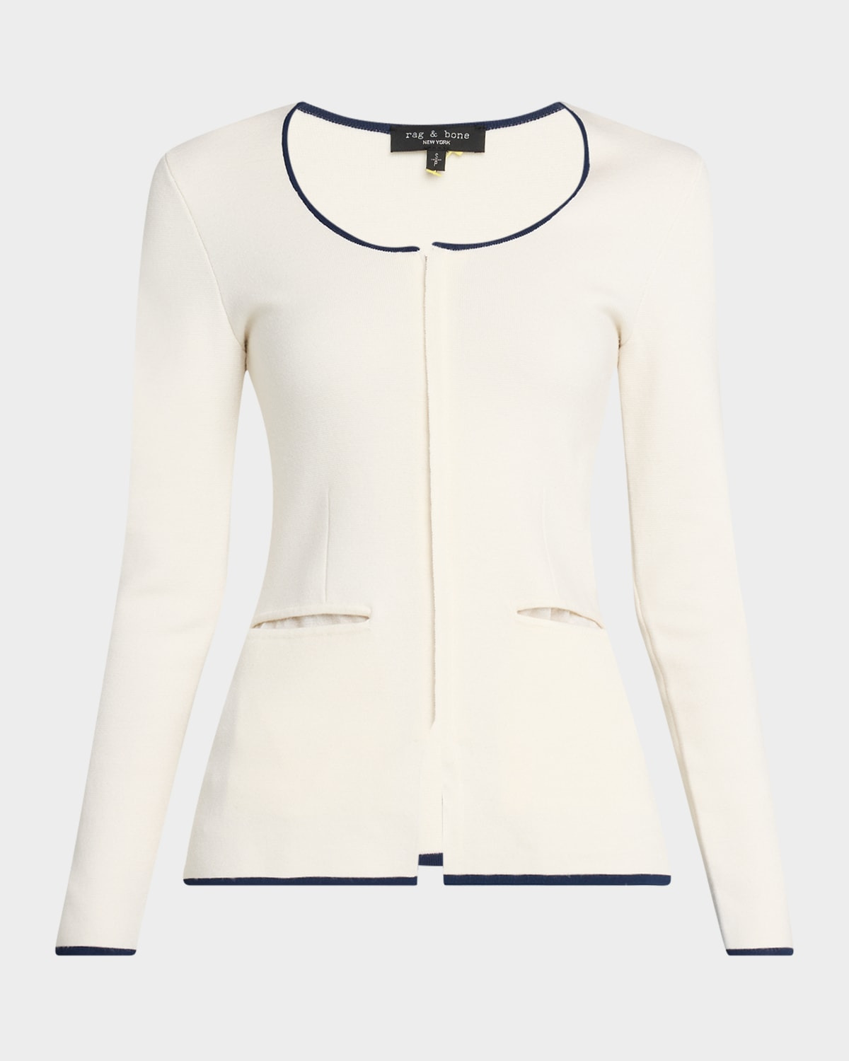 - Rag & Bone "Ella" wool-blend top featuring contrast piping - Scoop neckline - Long sleeves - Waist welt pockets - Fitted - Hem sits at the hip - Concealed zip-front - Merino wool/nylon/polyamide/spandex - Dry clean - Imported