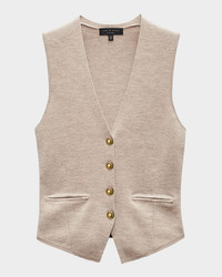 - Rag & Bone "Ella" vest - V neckline - Sleeveless - Welt pockets - Tailored fit - Cut-away hem - Button-front - Merino wool/nylon/polyamide/spandex - Dry clean - Imported