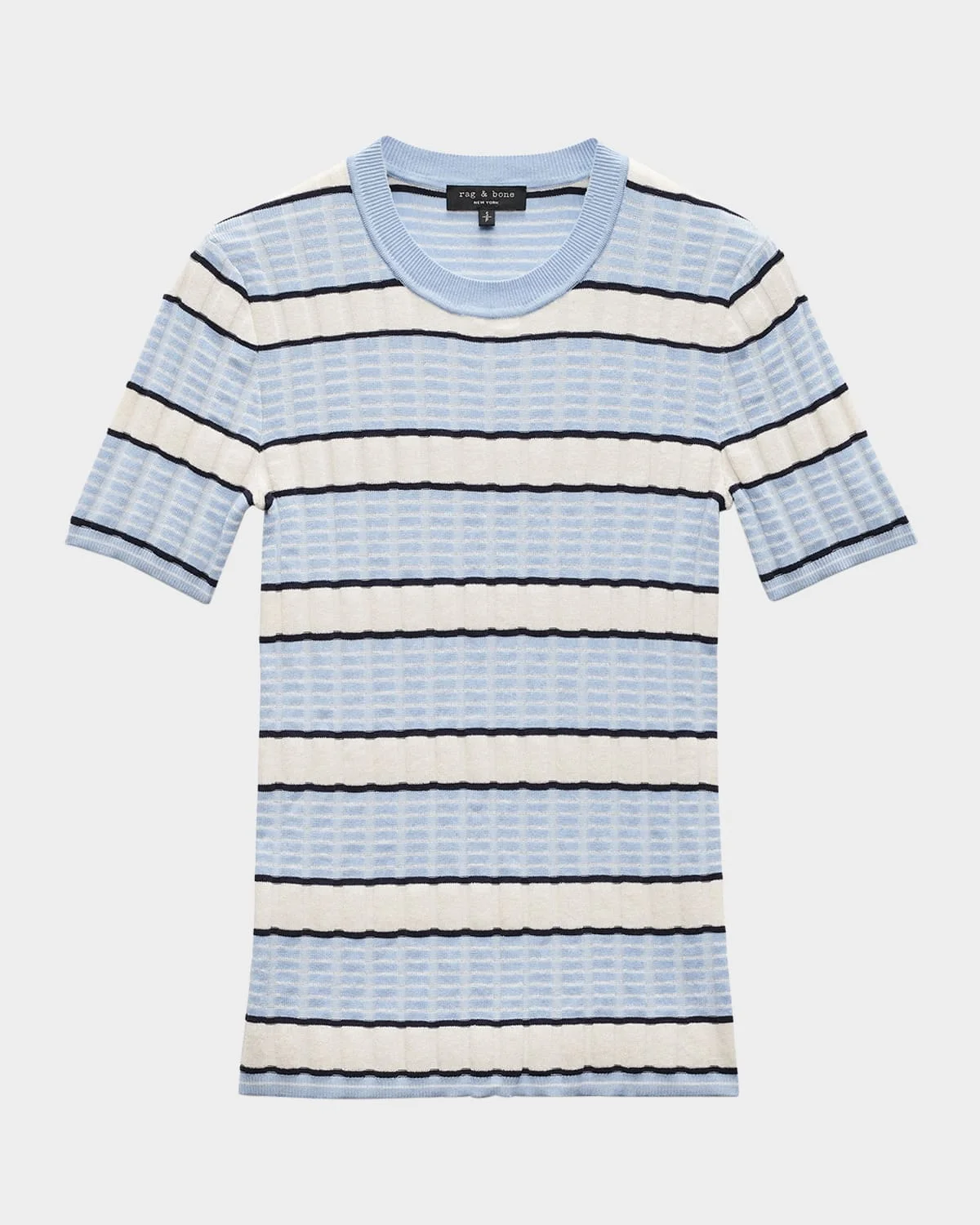 - Rag & Bone "Eloise" stripe ribbed tee - Crew neckline - Short sleeves - Easy fit - Hem sits at the hip - Pullover style - Viscose/nylon/polyamide/cotton - Unlined - Hand wash - Imported