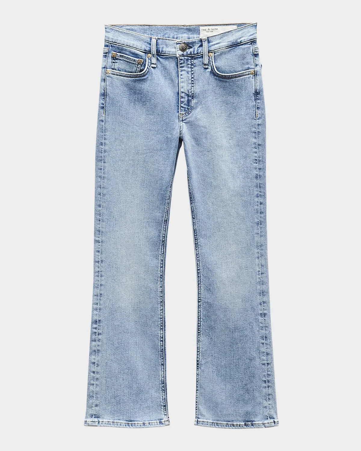 Rag amp; Bone "Epic Peyton" bootcut jeans in faded lightwash denim Approx. 9.8" rise; 27" inseam Midrise; sits high on the hip Fivepocket style Fitted through the hip and thigh Ankle length Button/zip fly; belt loops Cotton/Lycra xfit® spandex/lyocell Machine wash cold Imported