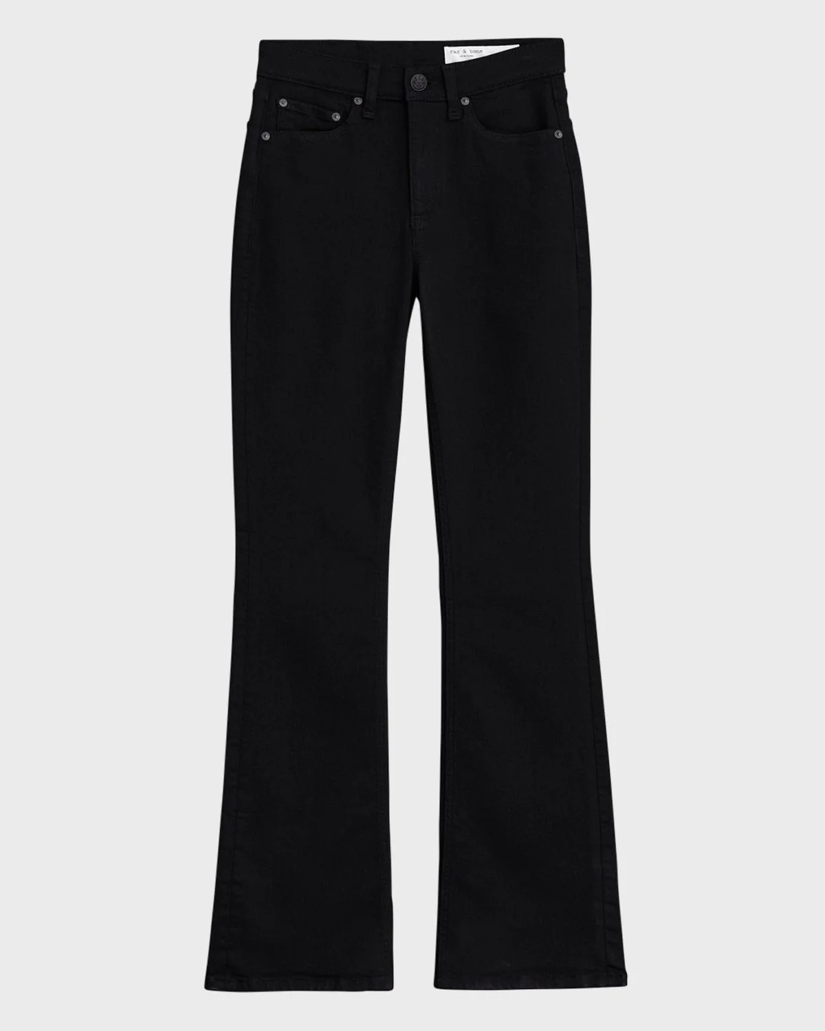 Rag amp; Bone "Flexi Peyton" bootcut jeans in black denim Approx. 32" inseam Midrise; sits high on the hip Fivepocket style Slim, straightfit Full length Button/zip fly; belt loops Viscose/cotton/Tencel® lyocell Machine wash Imported