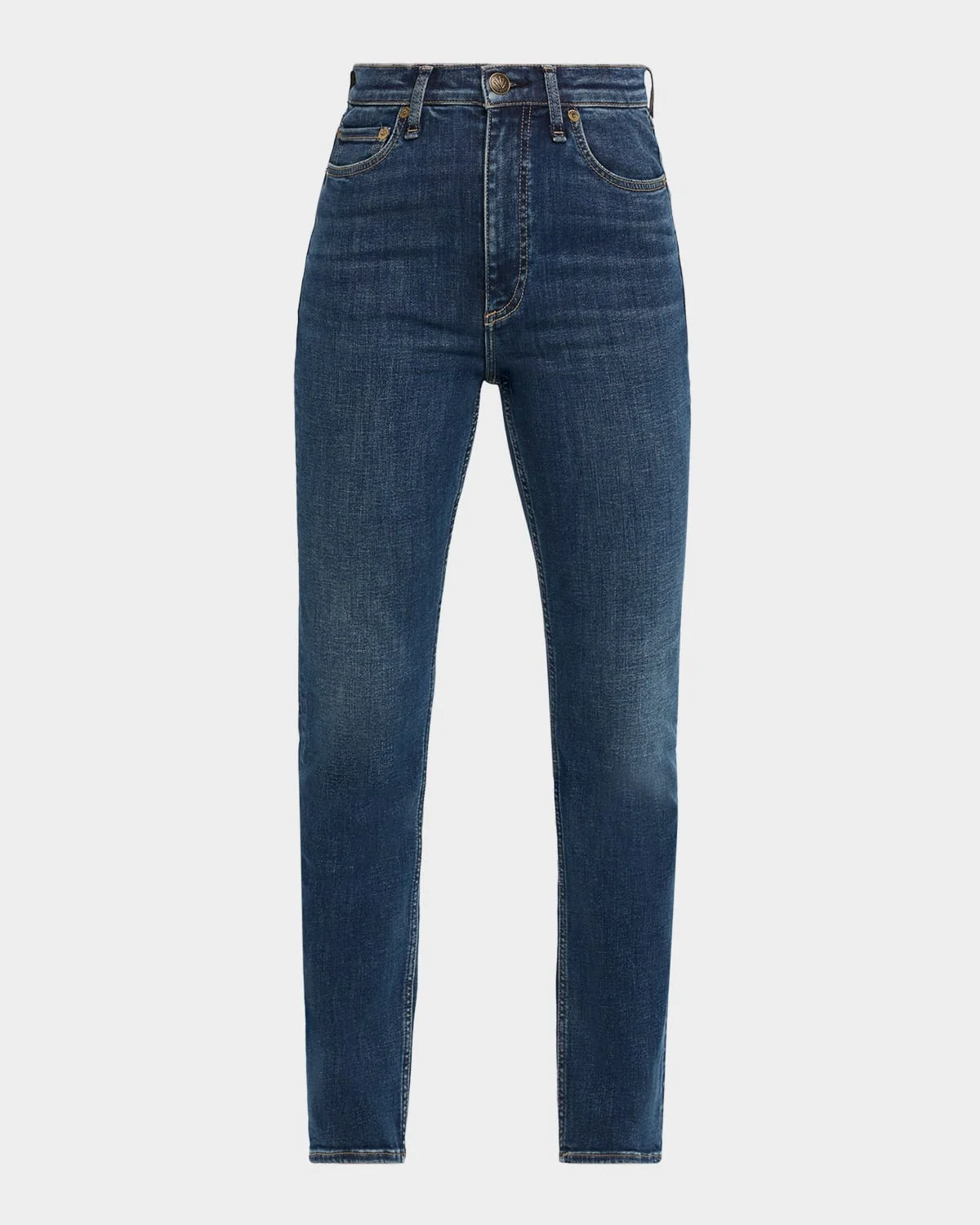 Rag amp; Bone "Flexi Wren" straightleg jeans in darkwash stretchdenim Approx. 11" rise; 30" inseam High rise Fivepocket style Slim fit Full length Button/zip fly; belt loops Cotton/polyester/spandex Machine wash cold Imported