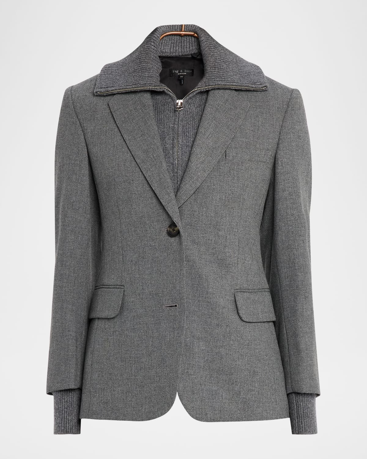 Crafted in solid wool, the "Frank" blazer by Rag amp; Bone includes a removable zipped sweater inlay for versatile styling. Notch lapels Singlebreasted front Long sleeves with button cuffs Chest welt pocket Hip flap pockets Tailored fit Twobutton front Wool Dry clean Imported