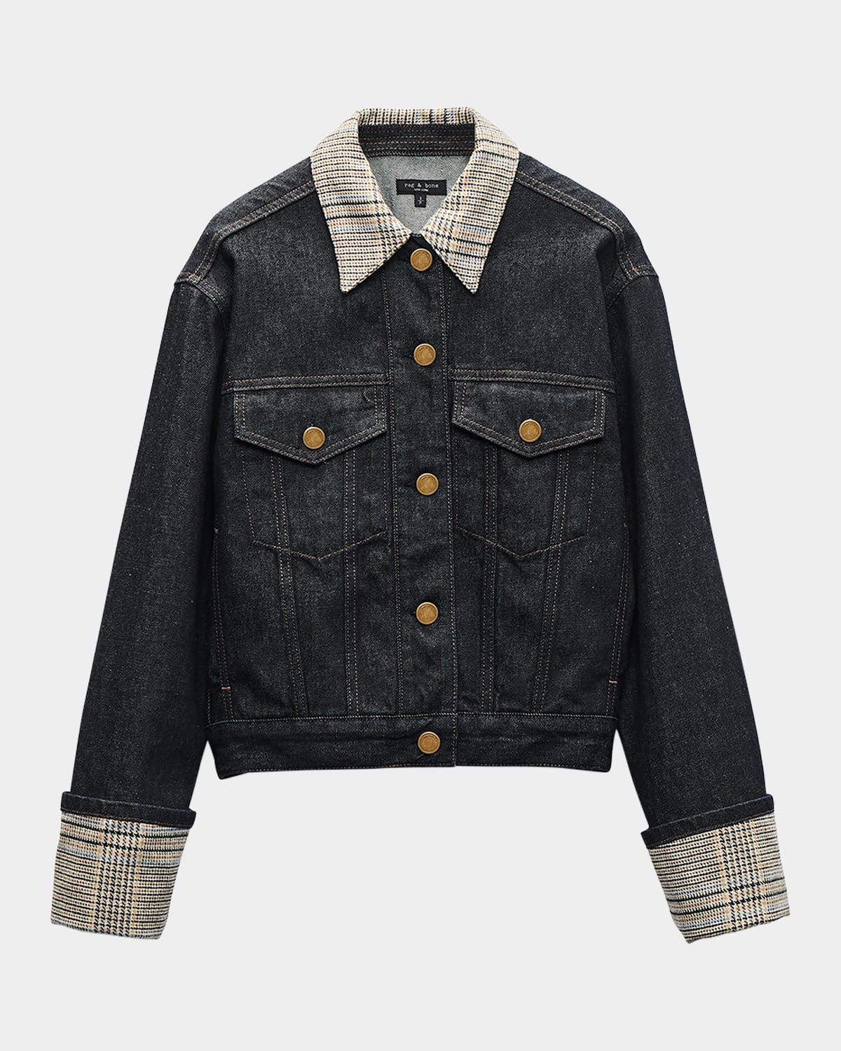 - A fresh take on the classic denim trucker, the "Harriet" jacket by Rag & Bone features plaid houndstooth trim for the perfect fall closet staple. - Spread collar - Dropped shoulders - Long cuffed sleeves - Dual chest pockets; side slip pockets - Relaxed fit - Button-front - Cotton/acrylic/wool - Machine wash cold - Imported