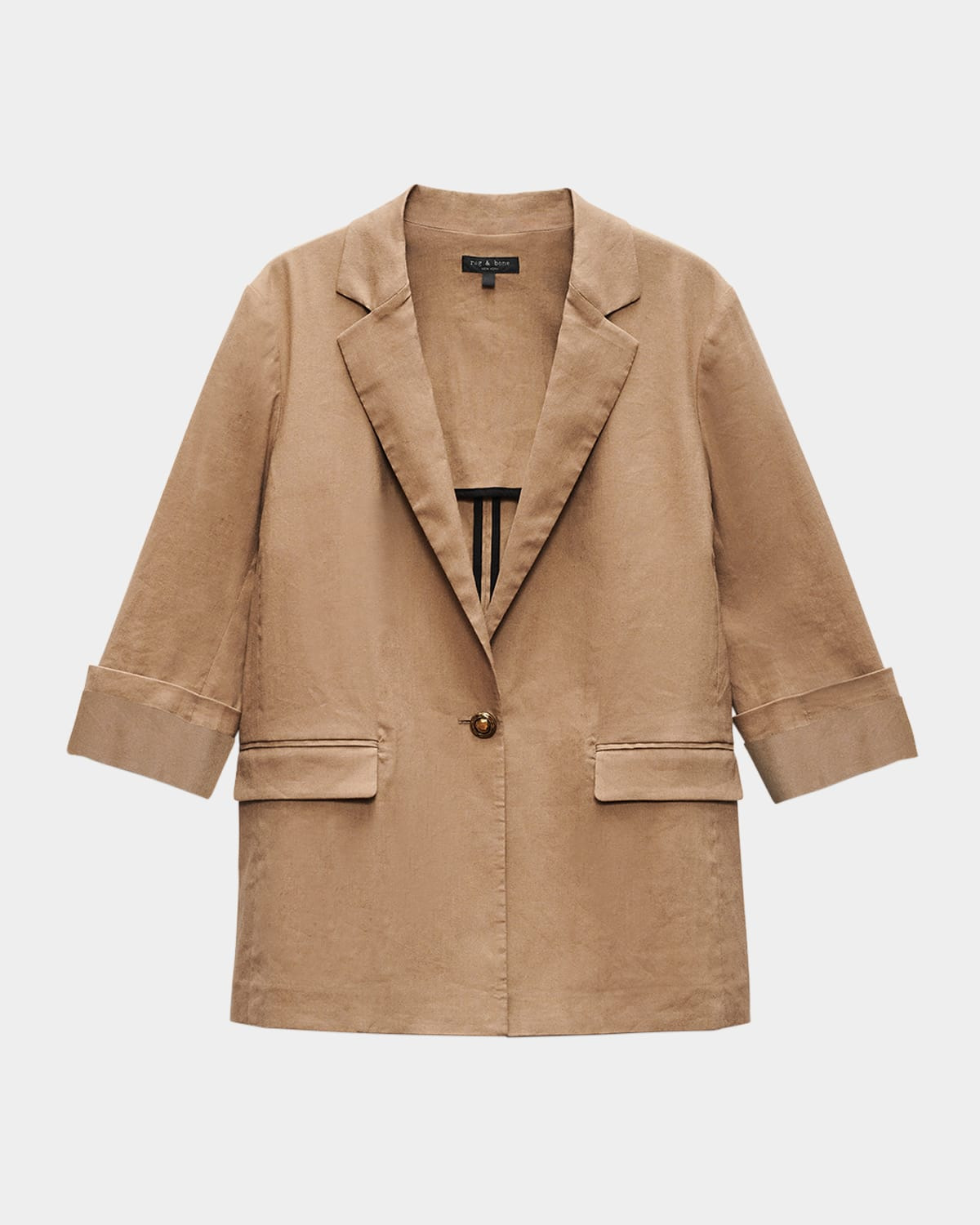 - Rag & Bone "Jennie" linen blazer with three-quarter cuffed sleeves - Notch lapels - Single-breasted front - Waist flap pockets - Relaxed fit - Button-front - Linen/viscose/spandex - Dry clean - Imported