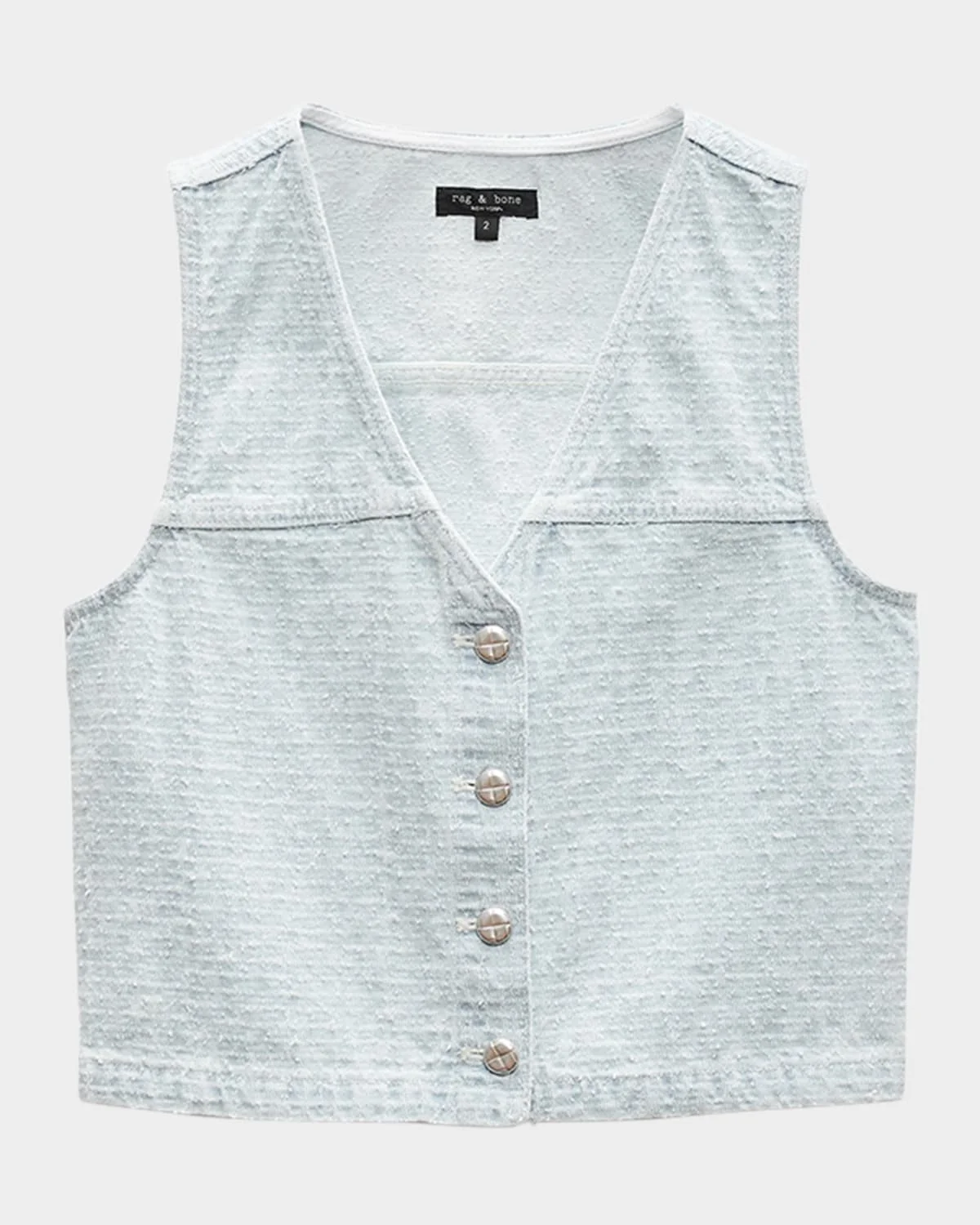 - Rag & Bone "Juliana" vest in denim tweed - V neckline - Sleeveless - Tailored fit - Hem sits at the hip - Button-front - Cotton - Unlined - Machine wash cold - Imported