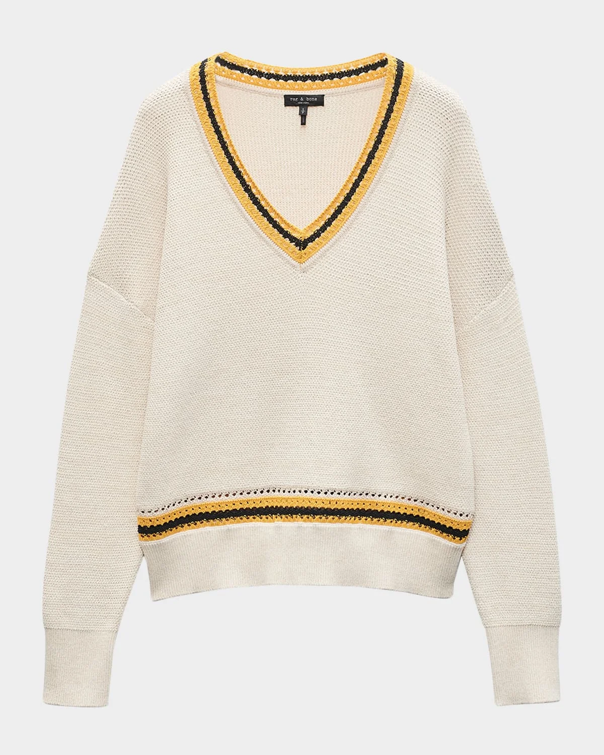 - Rag & Bone "Meghan" knit sweater featuring contrast trim - V neckline - Dropped shoulders - Long sleeves - Relaxed fit - Hem falls to the hip - Pullover style - Cotton/nylon/polyamide/viscose - Dry clean - Imported