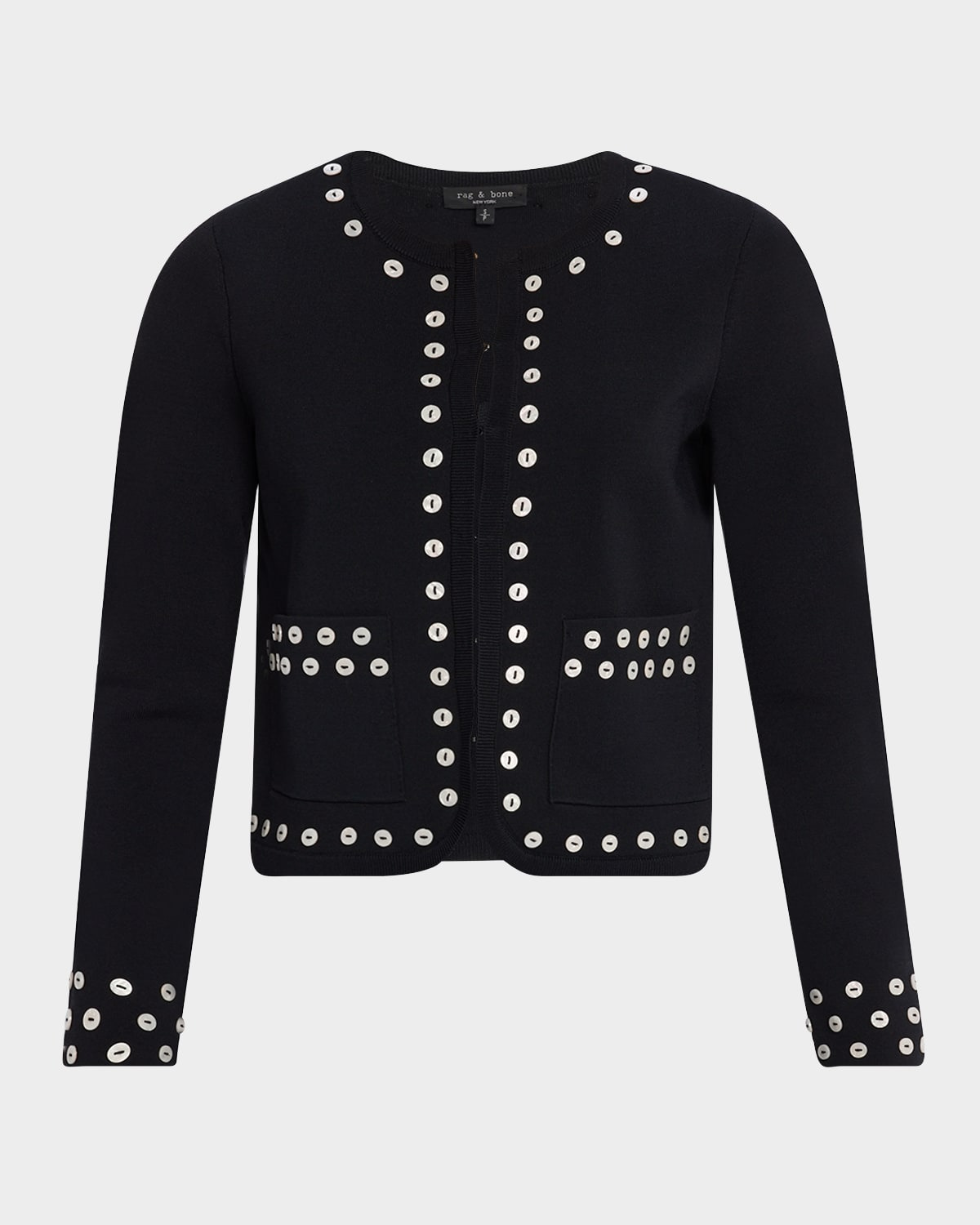 - Rag & Bone "Melo" knit cardigan with embellished trim - Round neckline - Long sleeves - Patch pockets - Tailored fit - Hem sits at the hip - Front hook closure - Viscose/nylon/polyamide/spandex - Unlined - Dry clean - Imported