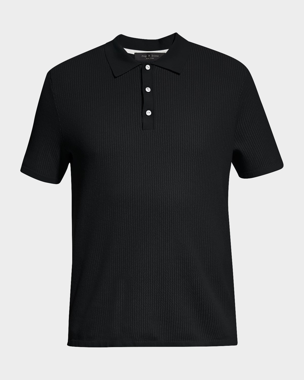 - Rag & Bone "Harvey" polo shirt in a solid knit - Spread collar; three-button placket - Short sleeves - Relaxed fit - Pullover style - Cotton/viscose/nylon - Imported - Model is 6'1"/185cm.