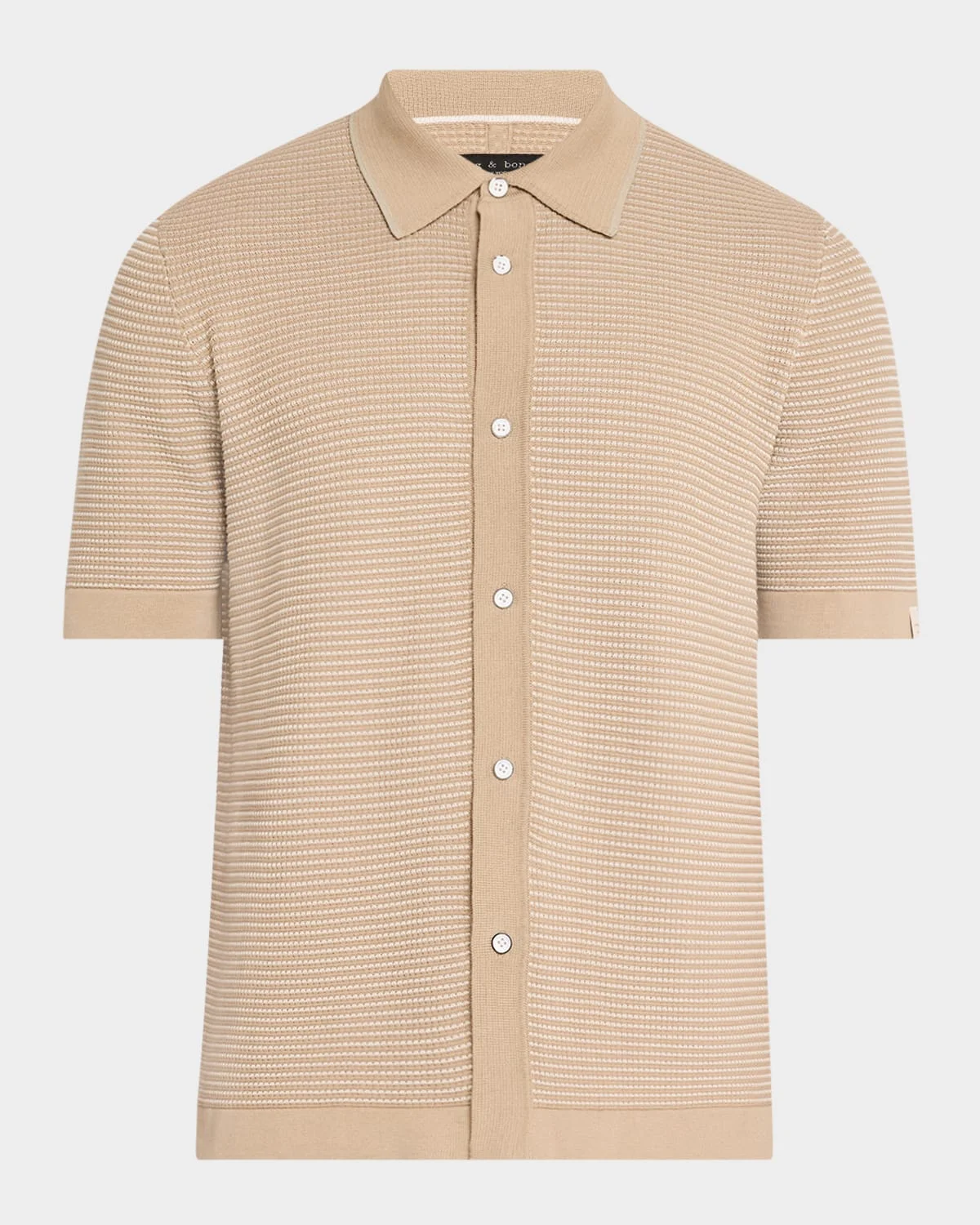 - Rag & Bone "Jonah" shirt in textured stripes - Spread collar - Button placket - Short sleeves - Center back seam - Cotton/viscose/nylon/polyamide - Machine wash cold, line dry - Imported