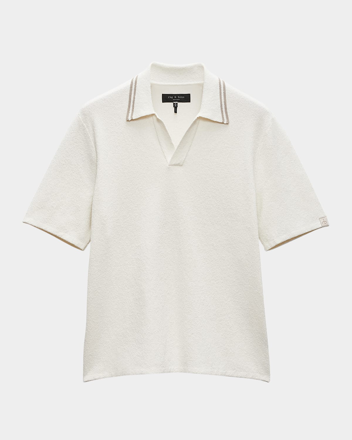 - Rag & Bone polo shirt made from soft, absorbent zuma toweling - Tipped spread collar - Open placket - Short sleeves - Regular fit - Cotton/nylon/polyamide/spandex - Machine wash cold, line dry - Imported