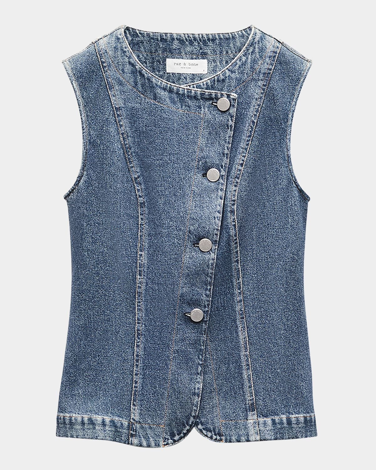 - Rag & Bone "Miramar Olivia" digitally-printed denim vest crafted from a soft stretch-knit - From the Miramar Refine Knit collection - Round neckline; asymmetric button-front - Sleeveless - Slim fit - Vented back - Promodal® rayon/nylon/polyamide/spandex - Machine wash - Imported