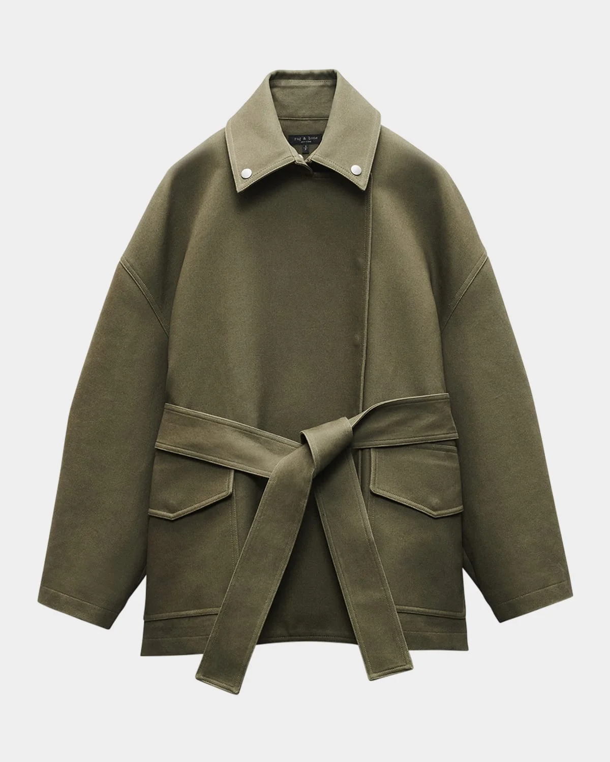 - Rag & Bone "Rue" felted cotton jacket wi - Point collar; asymmetric snap-front - Dropped shoulders - Long sleeves with snap cuffs - Removable self-tie belt - Flap pockets - Relaxed fit - Vented back - Cotton - Imported