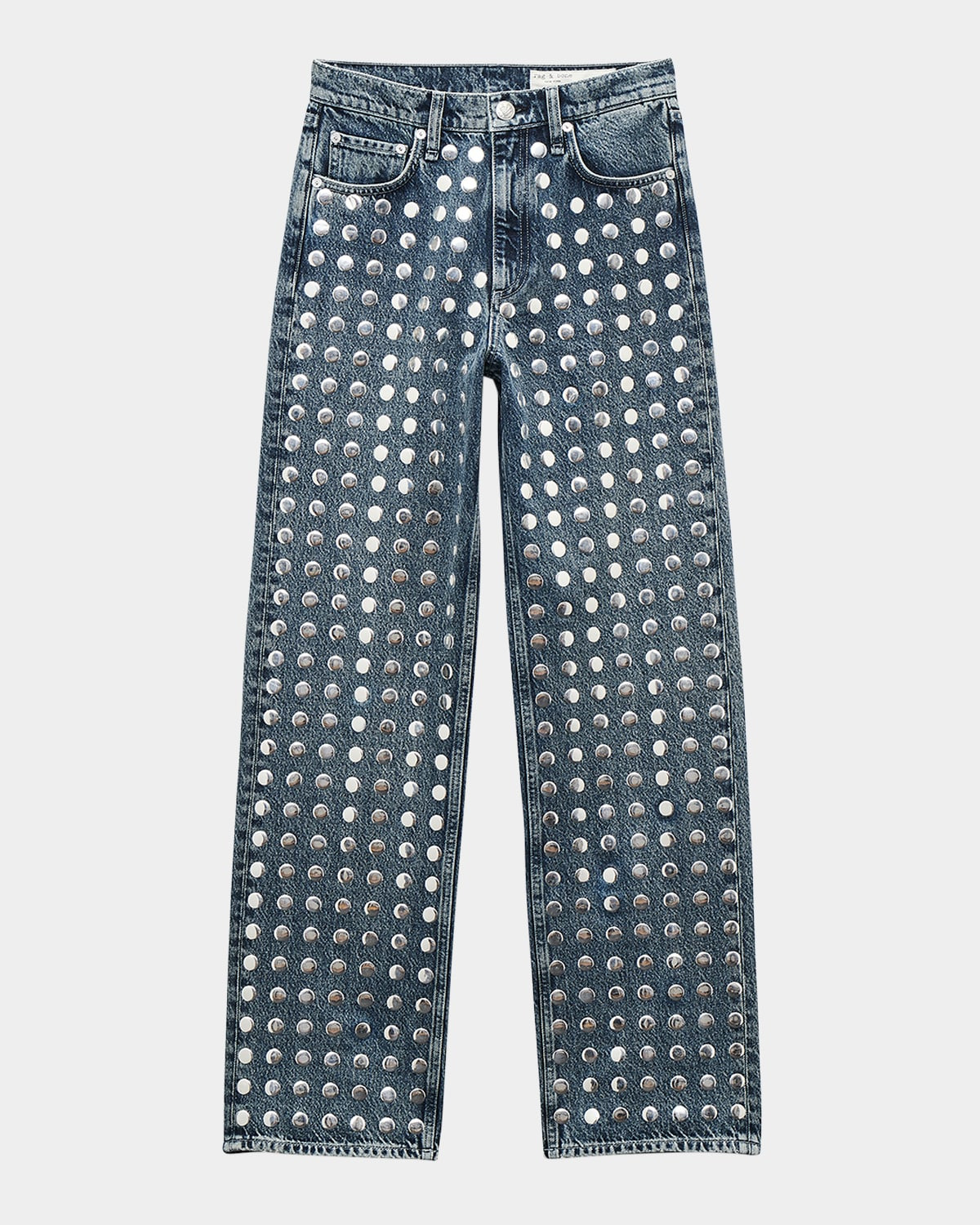 - Rag & Bone "Shea" straight-leg jeans embellished with silver-tone studs - Approx. 12" rise; 32 " inseam - High rise - Five-pocket style - Relaxed fit - Full length - Button/zip fly; belt loops - Cotton - Machine wash cold inside out - Imported