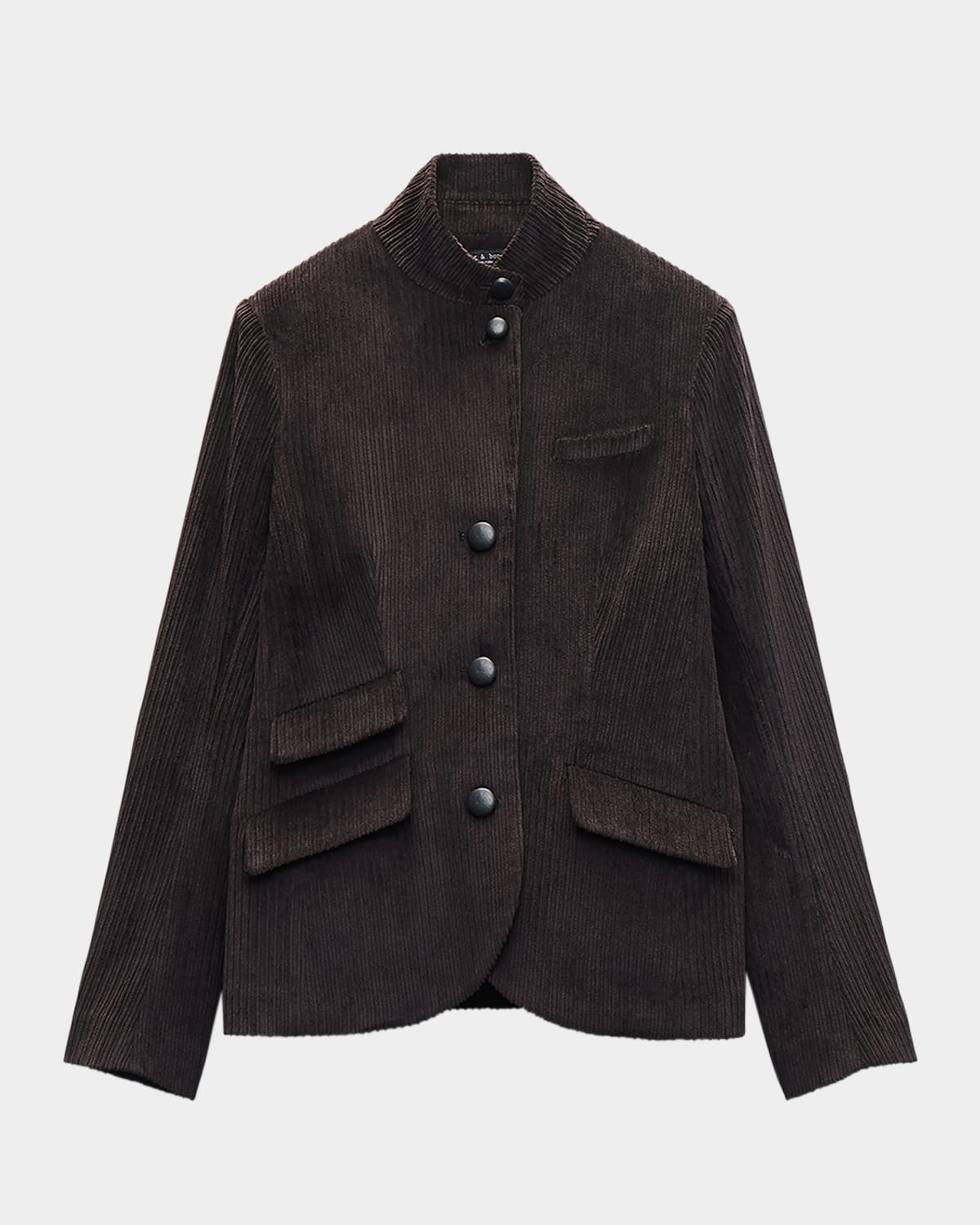 Rag amp; Bone "Slade" blazer in corduroy with a soft hand feel. Stand collar Singlebreasted front Long sleeves with button cuffs Chest welt pocket Waist flap pockets Tailored fit Rounded hem Buttonfront Polyester/elastane Dry clean Imported