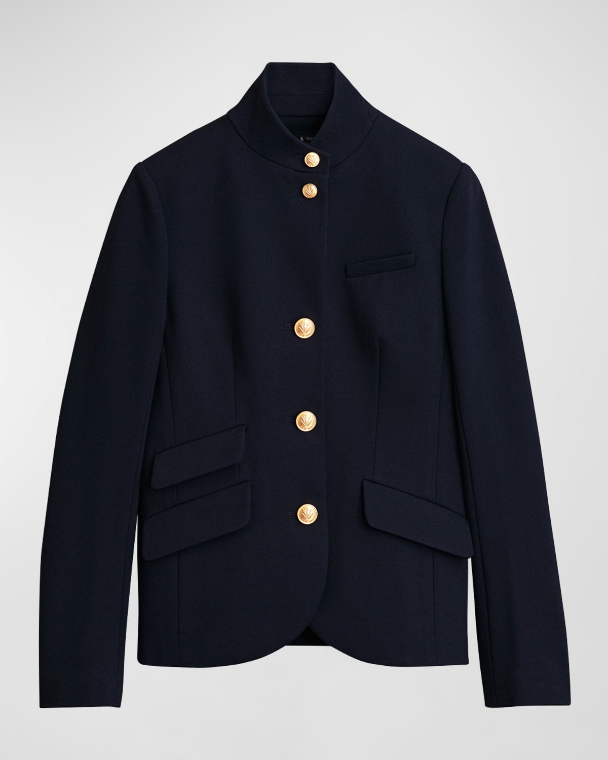 - Rag & Bone "Slade" ponte blazer - Stand collar - Single-breasted front - Long sleeves; button cuffs - Front flap pockets - Tailored fit - Button-front closure - Viscose - Dry clean - Imported - Size Note: Item runs small, consider ordering a size up.