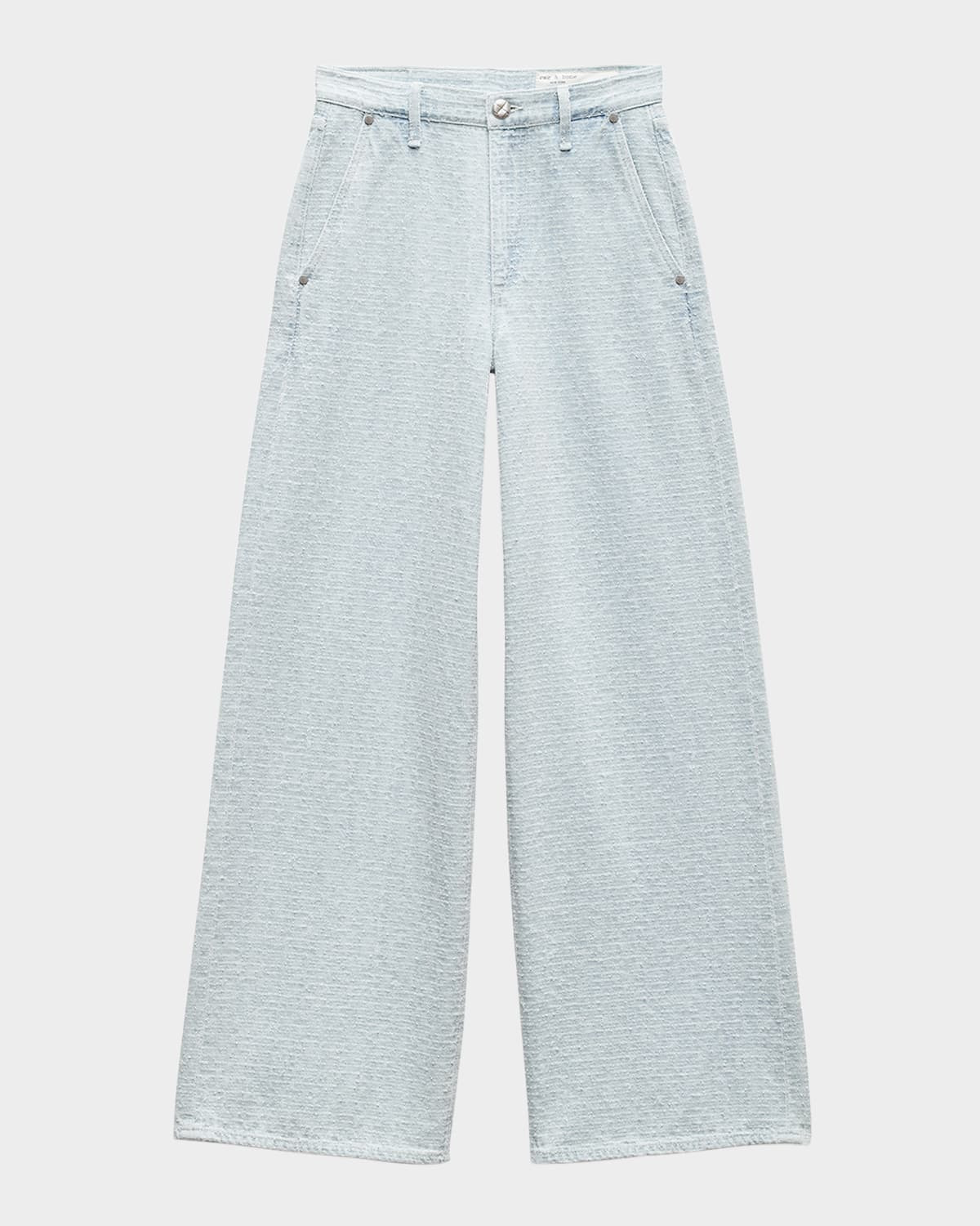 - Rag & Bone "Sofie" wide-leg trouser jeans in denim tweed - Approx. 33" inseam - High rise - Four-pocket style - Tailored fit - Full length - Button/zip fly; belt loops - Cotton - Machine wash cold - Imported