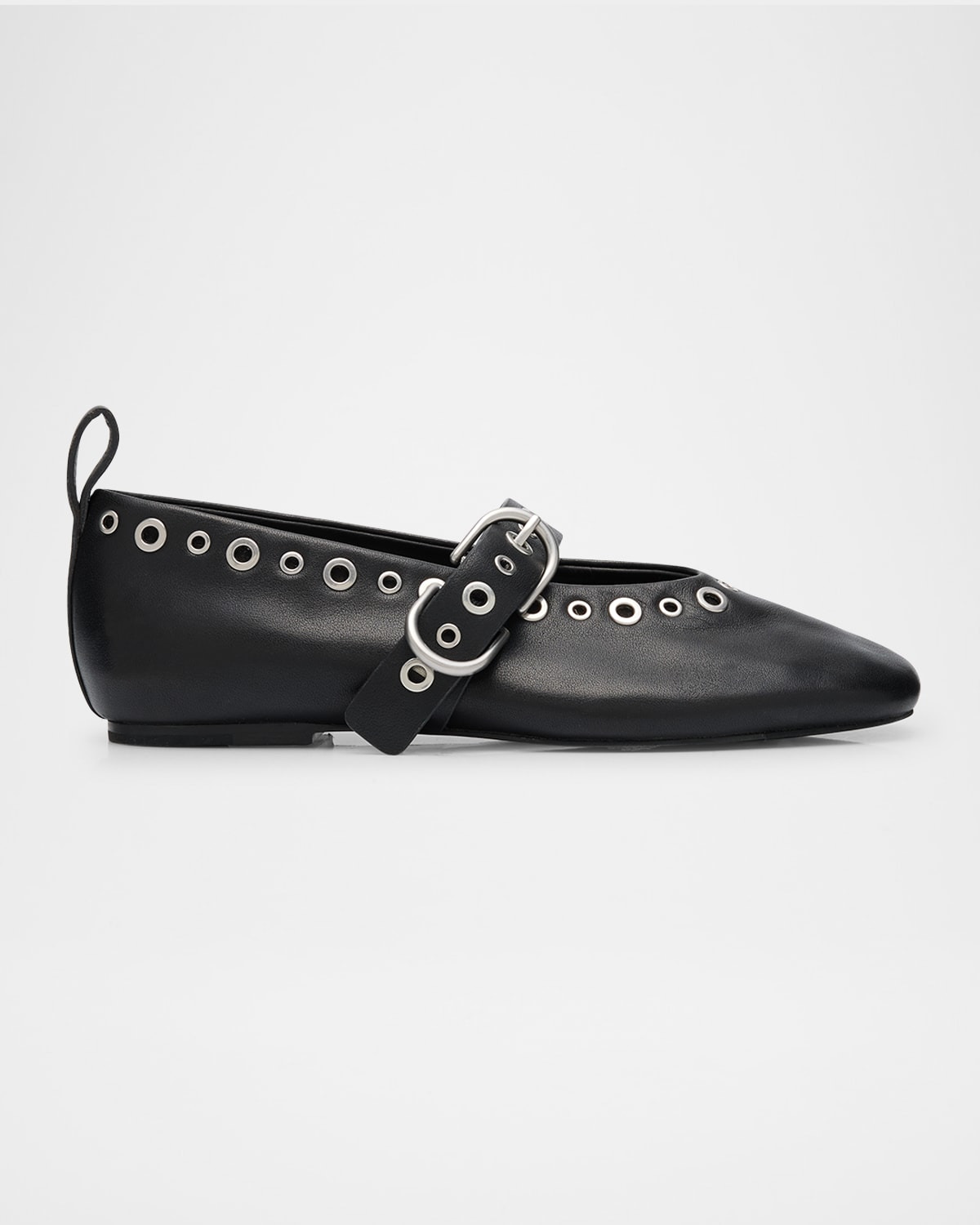 - Rag & Bone "Spire" leather ballerina flats with grommet detailing - OrthoLite® Lazy-Hybrid™ is a proprietary dual-layer construction that starts with our slow memory Lazy foam combined with our patented Hybrid design to achieve 20% recycled content, delivering a customized fit that quickly molds to the foot's shape and instantly rebounds when the foot is removed. - The base layer foam utilizes OrthoLite® Recycled, a dedicated base layer foam containing 98% recycled postproduction waste material that delivers support, stability, uncompromised comfort, and performance underfoot. - 0.17 in / 5 mm flat heel - Round toe - Mary Jane buckle strap - Leather/Rubber outsole - Lining: Leather - Leather method dry cleaning - Imported