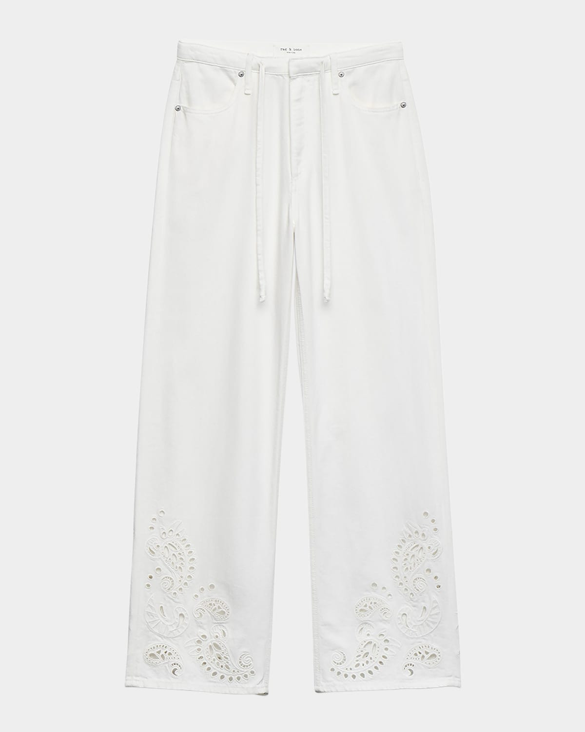 - Rag & Bone "Ultra Featherweight Phoebe" jeans featuring an embroidered hem in white denim - Approx. 30.5" inseam - Low-rise; sits at the hip - Drawstring waistband - Four-pocket style - Wide legs - Full length - Snap/zip fly; belt loops - Cotton/lyocell - Machine wash - Imported
