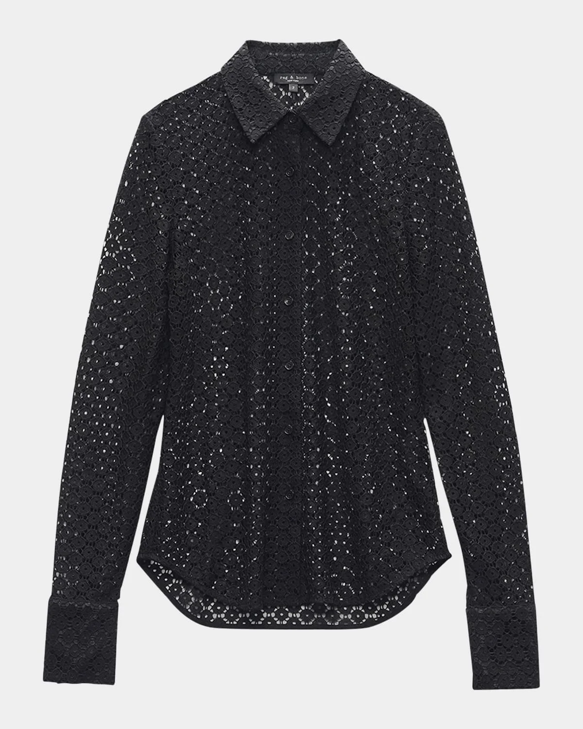 Rag amp; Bone "Yvette" lace shirt featuring a buttonfront Point collar Long sleeves with button cuffs Fitted silhouette Rounded hem Nylon/polyamide/elastane Unlined Dry clean Imported