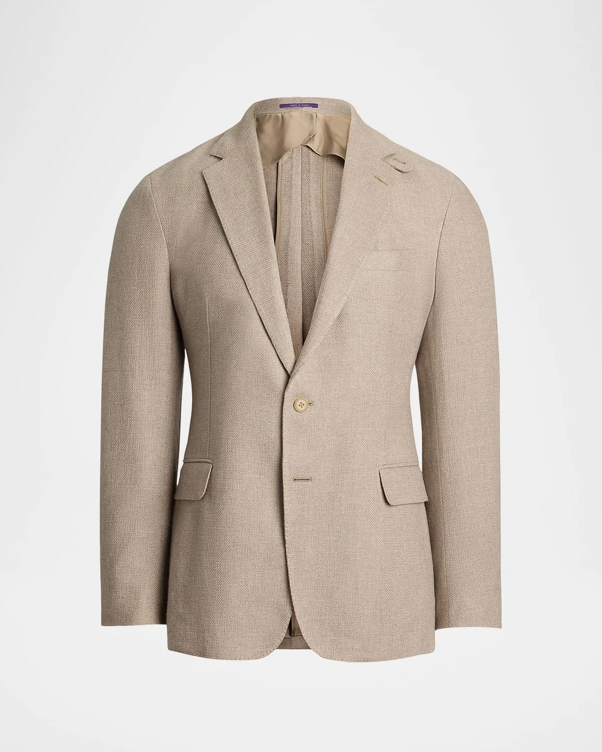 - Ralph Lauren Purple Label sport coat stylized in a wool blend resulting in a luxurious allure - Notched lapels; throat latch - Single-breasted front - Chest welt pocket - Hip flap pockets - Long sleeves - Four-button cuffs - Double-vented back - Wool/silk/cashmere - Made in Italy