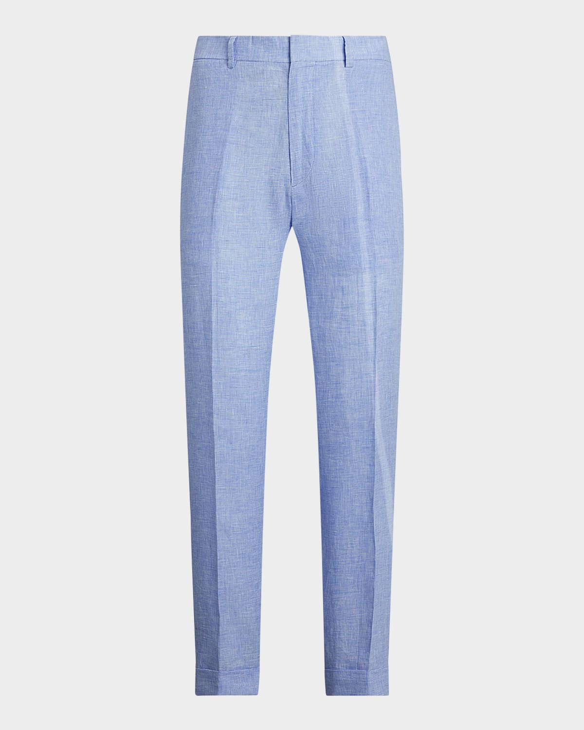 - Ralph Lauren hand-tailored trousers made from a lightweight linen cloth that was custom-developed for Ralph Lauren - Regular rise - Belt loops - Zip fly with button closure - Genuine mother-of-pearl button - Two front angled pockets - Coin pocket - Two back buttoned pockets - Comes unhemmed with a 38.25" inseam - Linen - Unlined - Dry clean - Made in Italy - Size 32w has a 9.75" rise and a 15.5" leg opening. Model is 6'1" (185 cm) and wears a size 32w.