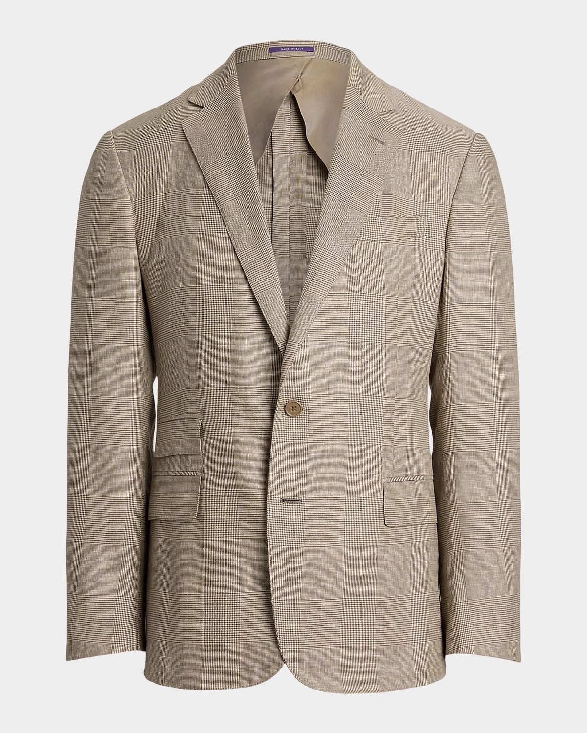 - Ralph Lauren Purple Label hand-tailored sport coat crafted from a custom-developed blend of lightweight linen and mulberry silk - Approx. 30.25"L from shoulder to hem - Light construction with fine canvassing - Notch lapels - Buttonhole at the left lapel - Two-button front - Natural profile soft shoulders - Unfinished cuffs for custom-tailoring - Chest welt pocket - Ticket pocket - Waist flap pockets - Two interior chest pockets - Double vented back - Half-lined - Linen/mulberry silk - Lining: Cupro/viscose/wool - Dry clean - Made in Italy