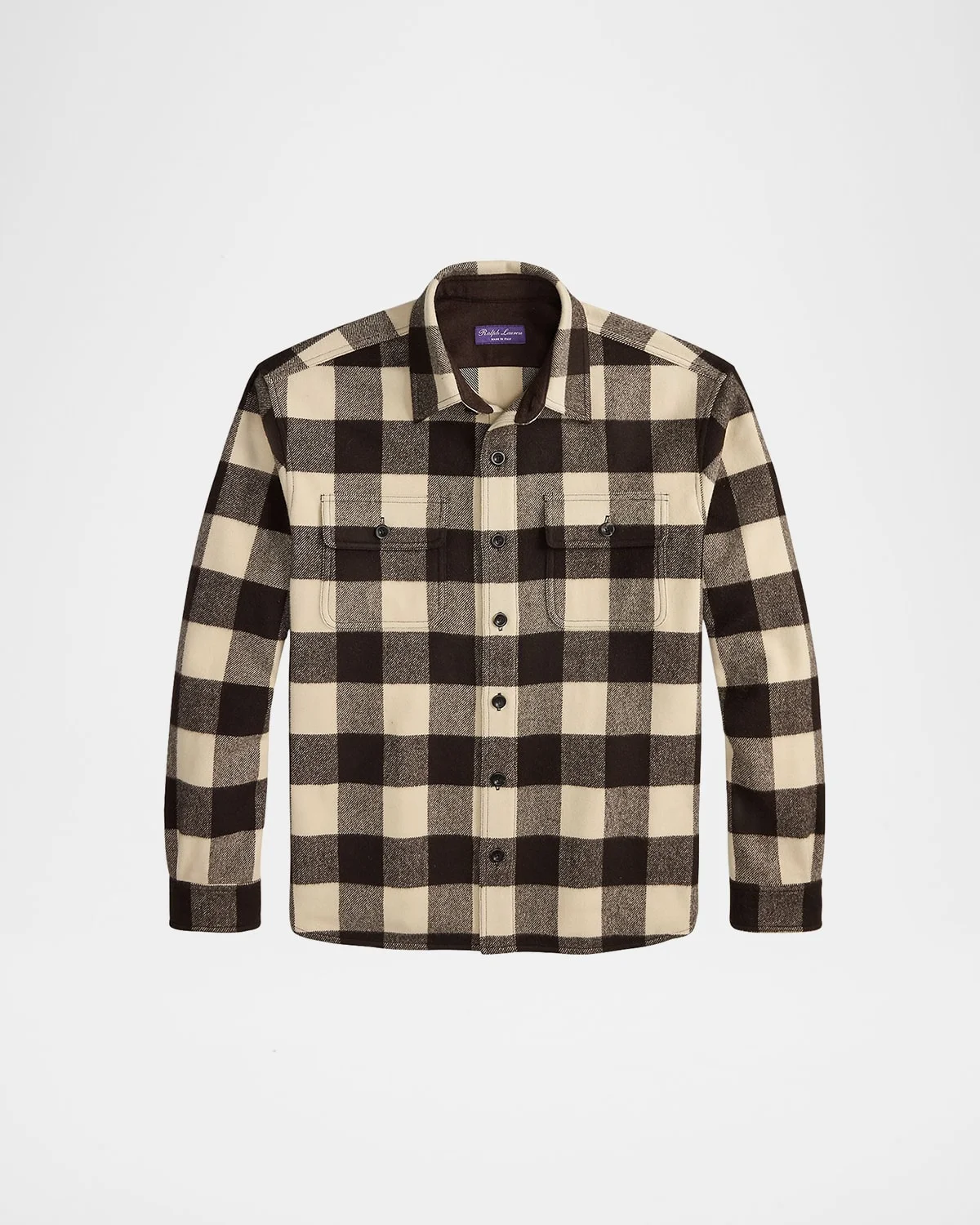 Ralph Lauren Purple Label overshirt in luxe merino wool for durable warmth, finished with a bold check pattern Buttoned chest flap pockets Point collar Button placket Round barrel cuffs Shirttail hem Classic fit Wool Made in Italy