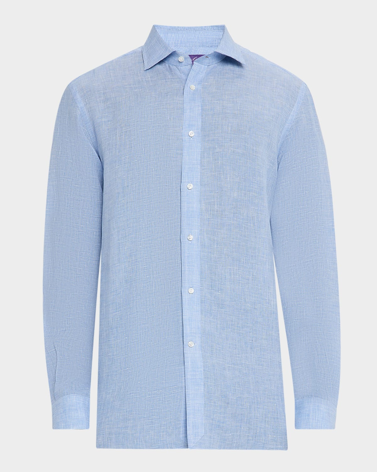 - Ralph Lauren Purple Label sport shirt in lightweight, micro-houndstooth weave - Classic wide-spread collar; 3" point length and 5" spread - Signature collar stays - Buttoned placket - Long sleeve; approx. 35.5"L - Buttoned barrel cuffs - Genuine mother-of-pearl buttons - Split pleated back yoke ensures smooth, contoured shoulders - Linen - Unlined - Machine wash - Made in Italy - Size 15.5 has a 31.5" back body length, an 18.75" shoulder, a 43" chest, and a 35.5" sleeve length. Sleeve length is taken from the center back of the neck. Model is 6'1" (185 cm) and wears a size 15.5.
