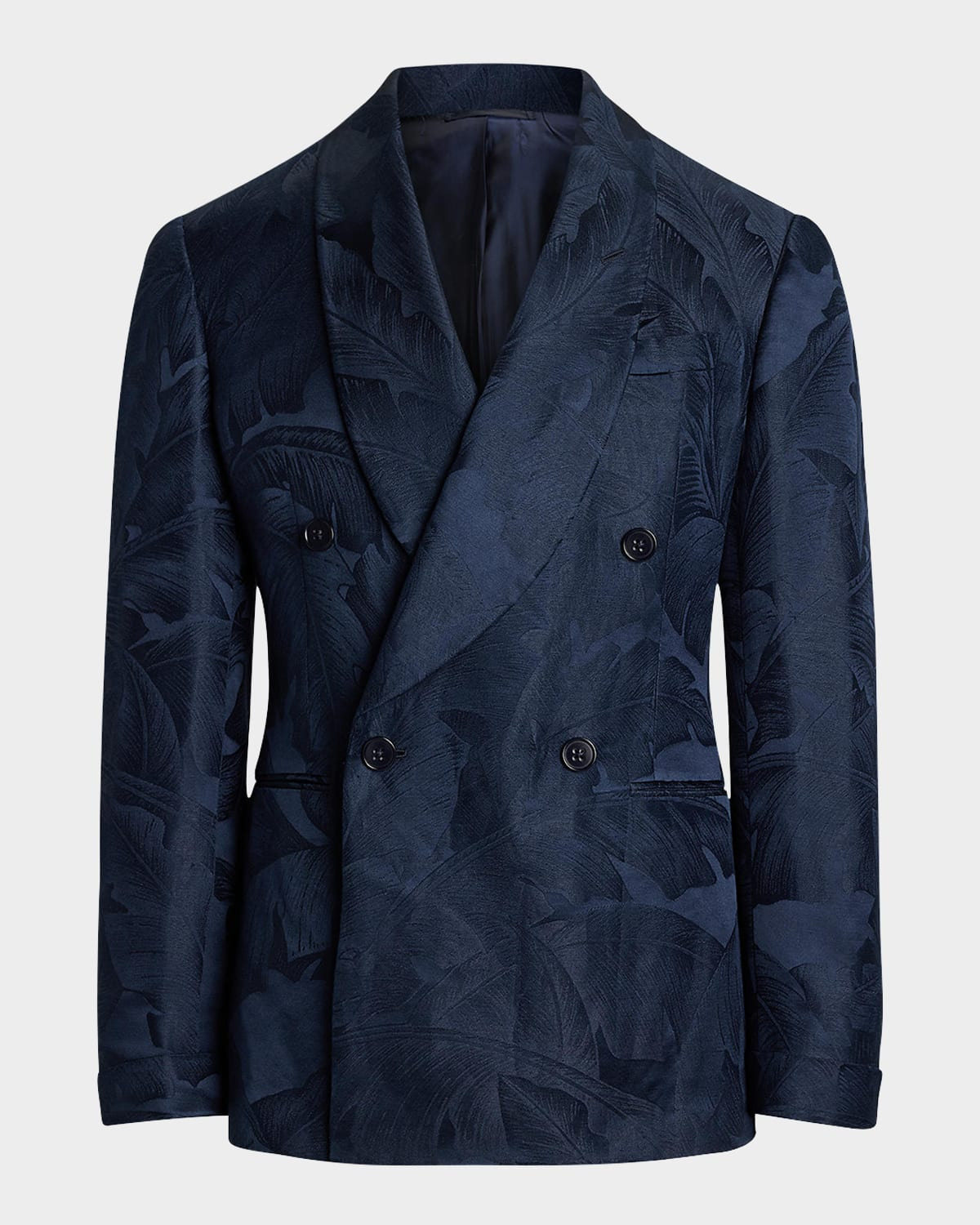 - Handcrafted in Italy, the Kent combines a lighter construction with fine canvassing and a soft shoulder to create a more natural profile. This version was made exclusively for Neiman Marcus and features a tonal palm leaf motif. Its jacquard fabric was custom-developed using luxurious linen and mulberry silk. Lighter construction with finer canvassing and a roped shoulder. Shawl collar. Buttonhole at the left lapel. Double-breasted silhouette. Unfinished gauntlet cuffs ready for custom-tailoring. Left chest welt pocket. Two front waist besom pockets. Two interior chest pockets. Fully lined. Size 40r has a 30" front body length, a 29.75" back body length, an 18.5" shoulder, and a 17.75" sleeve inseam. Model is 6'1" (185 cm) and wears a size 40r. - Neiman Marcus x Ralph Lauren Purple Label "Kent" jacket with a custom-developed jacquard fabric featuring a tonal palm leaf motif - Approx. 30"L - Shawl collar; double-breasted silhouette - Long sleeves; unfinished gauntlet cuffs - Chest welt pocket - Waist besom pockets - Linen/mulberry silk - Lining: Cupro - Dry clean - Made in Italy