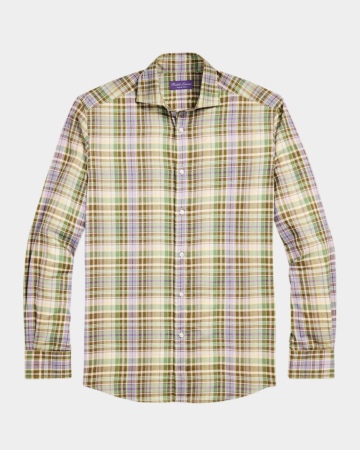 - In the season’s color palette, this shirt is expertly crafted in Italy using superfine cotton twill that was custom-developed with a storied Italian mill. Its lightweight cloth features a brushed texture for superior softness. - Ralph Lauren Purple Label casual button-down shirt in lightweight superfine cotton twill that was custom-developed with a storied Italian mill - Size medium has a 31.5" body length (front and back), an 18.75" shoulder, a 43" chest, and a 35.5" sleeve length. Sleeve length is taken from the center back of the neck and changes 1" between sizes. - Classic wide-spread collar. 3” point length and 5” collar spread. Signature collar stays. - Features a brushed texture for superior softness - Spread collar - Signature collar stays - Button placket - Genuine mother-of-pearl buttons - Long sleeves with buttoned barrel cuffs - Pleated back yoke ensures smooth, contoured shoulders - Shirttail hem - Cotton - Unlined - Machine wash - Made in Italy - Model is 6'1" (185 cm) and wears a size medium.