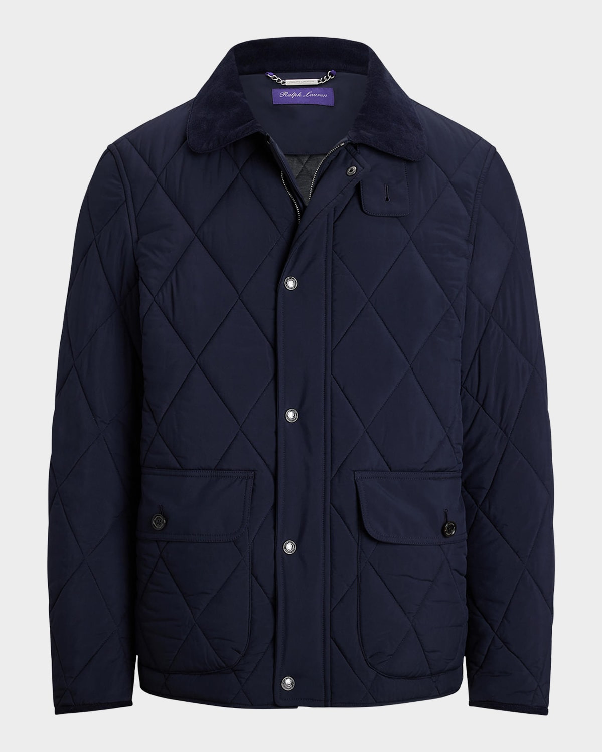 - Ralph Lauren Purple Label diamond quilted jacket - Approx. 30.75"L from shoulder to hem - Suede “Ralph Lauren”–debossed collar stand - Corduroy spread collar - Buttoned throat latch - Snap placket over two-way zip front - Leather zipper pull - Long sleeves - Snapped cuffs with corduroy binding - Ventilating metal grommets at the underarms - Two front waist snapped pockets - Interior left waist pocket - Double vent with snapped closures - Genuine horn buttons - Fully lined and filled - Down/polyester fill - Polyester/cotton/cashmere - Lining: Cashmere/cotton/mulberry silk/nylon - Dry clean - Made in Italy - Size medium has a 30.75" front body length, a 28.25" back body length, a 19.5" shoulder, a 47" chest, and a 36" sleeve length. Sleeve length is taken from the center back of the neck and changes 1" between sizes. Model is 6'1" (185 cm) and wears a size medium.
