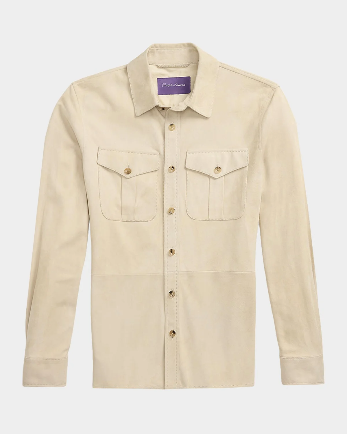 - Ralph Lauren Purple Label overshirt is crafted using a supple suede and genuine horn buttons. - Approx. 30"L from shoulder to hem - Point collar - Button front - Button/flap pockets - Buttoned barrel cuffs - Small side vents - Suede - Lining: Cotton/viscose - Leather method dry cleaning - Made in Italy