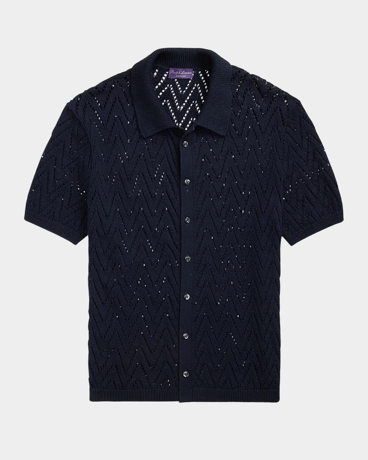 - Ralph Lauren cardigan sweater constructed with a textured-eyelet stitch - Approx. 25.5"L from shoulder to hem - Rib-knit point collar - Buttoned placket - Genuine mother-of-pearl buttons - Classic fit - Short sleeves - Rib-knit armbands and hem - Cotton - Unlined - Dry clean - Made in Italy - Size medium has a 25.5" body length (front and back), a 17.75" shoulder, and a 40" chest. Model is 6'1" (185 cm) and wears a size medium.