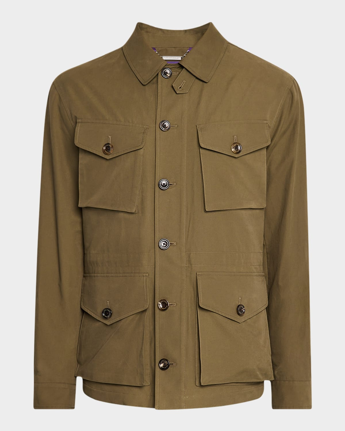 - Purple Label elevates the utilitarian nature of this jacket with elite Italian craftsmanship. Its shell is made with cotton-blend twill that features a water-resistant finish, while the interior is lined with haberdashery-quality wool flannel. - Ralph Lauren Purple Label field jacket in cotton-blend twill featuring a water-resistant finish - Size medium has a 30.5" front body length, a 29.75" back body length, a 20.25" shoulder, a 48" chest, and a 36" sleeve length. Sleeve length is taken from the center back of the neck and changes 0.75" between sizes. - Relaxed fit - Straight collar - Buttoned throat tab - Button placket - Genuine horn buttons - Two chest buttoned pockets - Two front waist buttoned pockets - Two interior chest pockets - Interior left waist pocket - Long sleeves with buttoned barrel cuffs - Interior drawstring waist - Wool flannel lining - Cotton/nylon/wool - Lining: Cotton/viscose - Dry clean - Made in Italy - Model is 6'1" (185 cm) and wears a size medium.