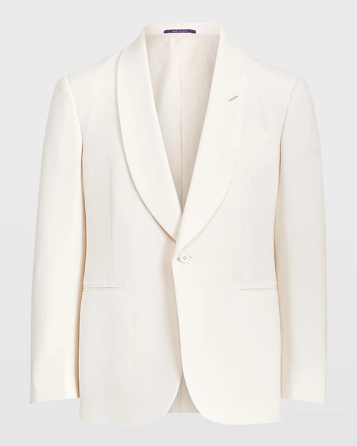 - Ralph Lauren Purple Label solid dinner jacket - Shawl lapels; single-button front - Chest and side welt pockets - Four-button sleeve finish - Double-vented back - Wool/silk - Made in Italy - Model is 6'1"/185cm.