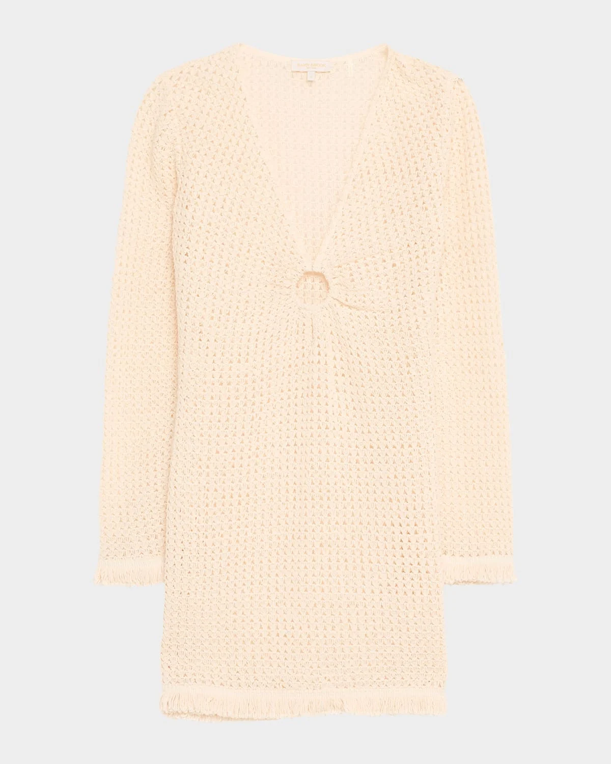 Complete with tonal fringe trim, the Cassie sun dress coverup by Ramy Brook is rendered in a crochet knit V neckline with an underbust ring accent & nbsp; Long sleeves Hem falls above the knee Shift silhouette Slipover style Cotton Hand wash Imported
