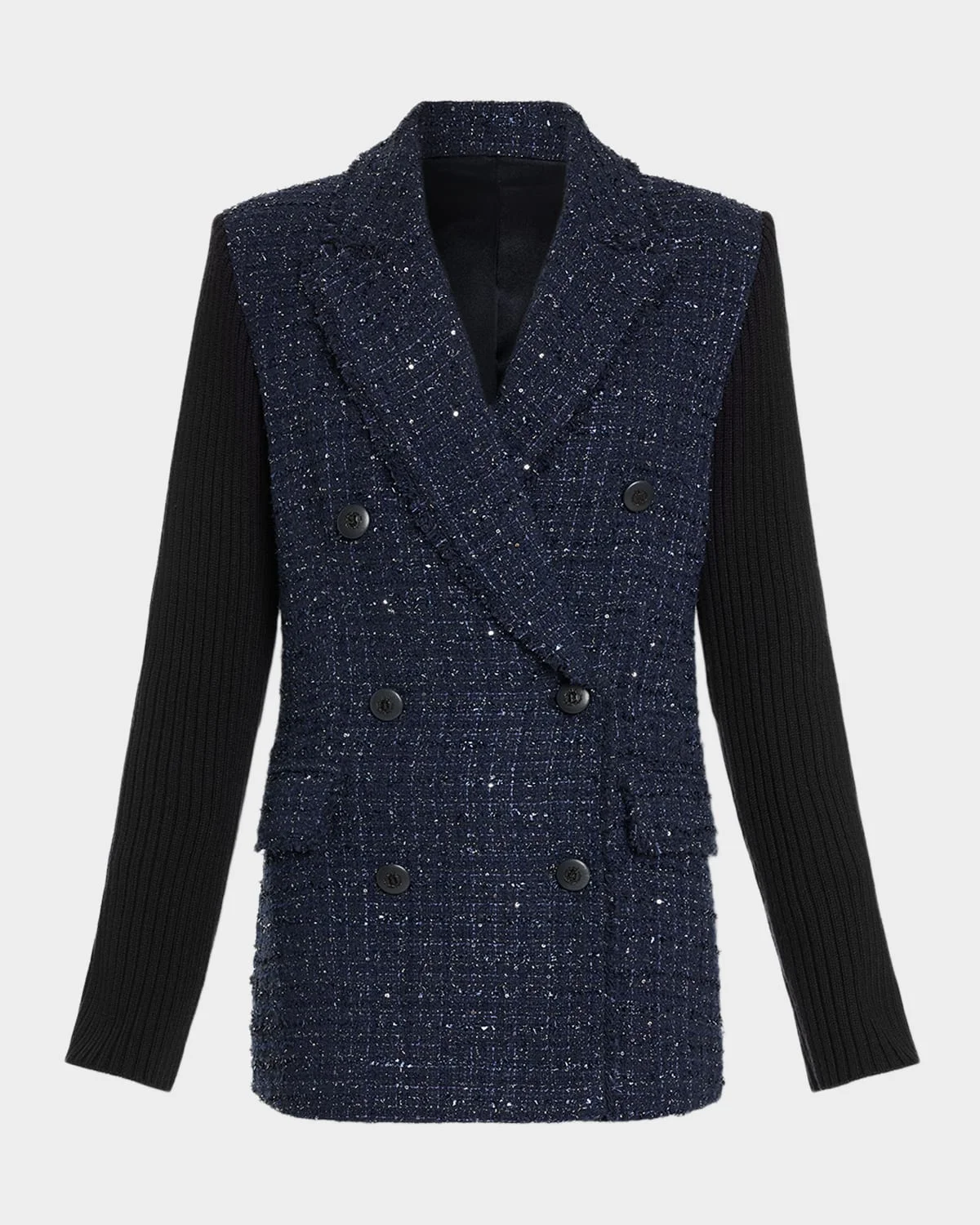 Accented with contrasting rib-knit sleeves, the Elsa blazer by Ramy Brook consists of a sequin-embellished tweed shell Approx. 26"L from shoulder to hem Peak lapels; double-breasted front Long sleeves Center-cut back vent Hip flap pockets Classic fit & nbsp; Hip length Cotton/acrylic/polyester Lining: Polyester/spandex Dry clean Imported
