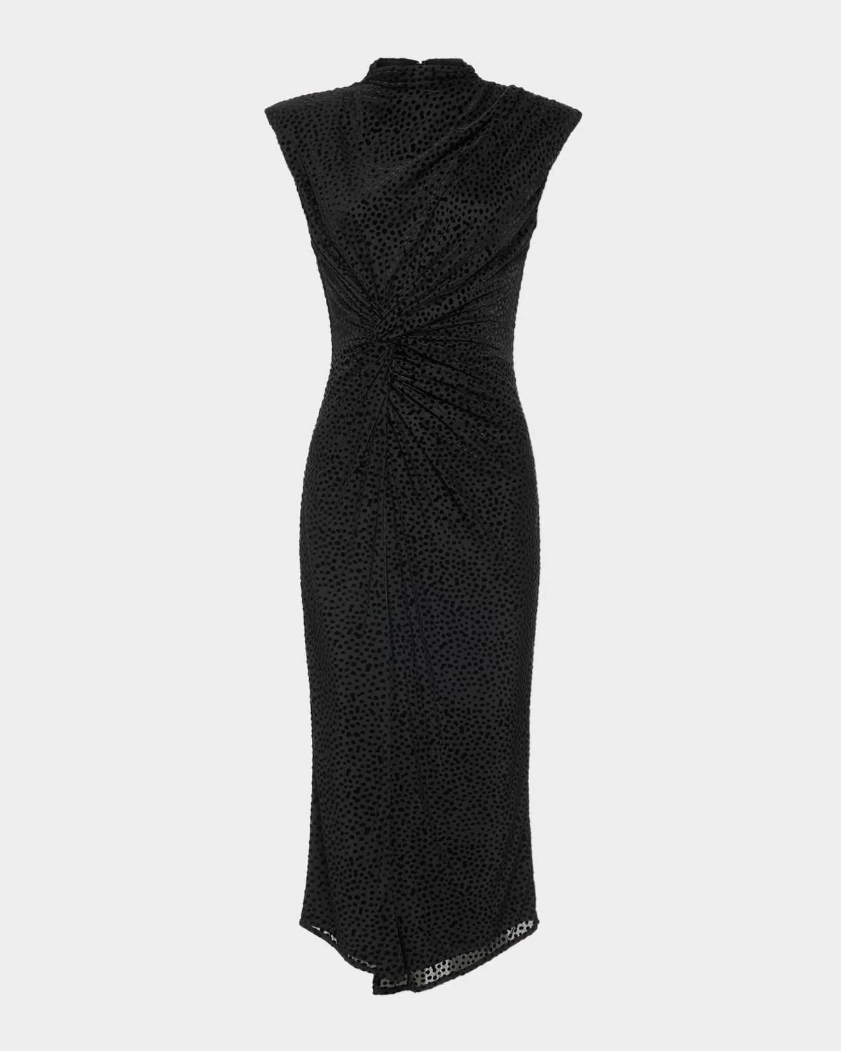Featuring a subtle spotted pattern, the Lee dress by Ramy Brook is defined by a flattering twist detail through the waist Approx. 42"L from shoulder to hem Mock neckline Padded shoulders Sleeveless Thigh-high front slit & nbsp; Hem falls below the knee Sheath silhouette Invisible back zipper Polyester/spandex Lining: Polyester Dry clean, machine wash cold, wash inside out Imported