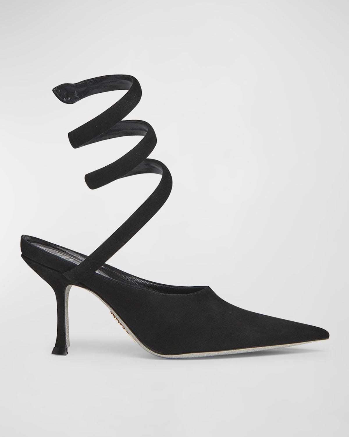 Rene Caovilla soft suede mule pumps. 3.15 in / 80 mm stiletto heel. Iconic covered spiral snake anklewrap strap. Pointed toe. Lining: Leather. Signature glittered outsole. Made in Italy.