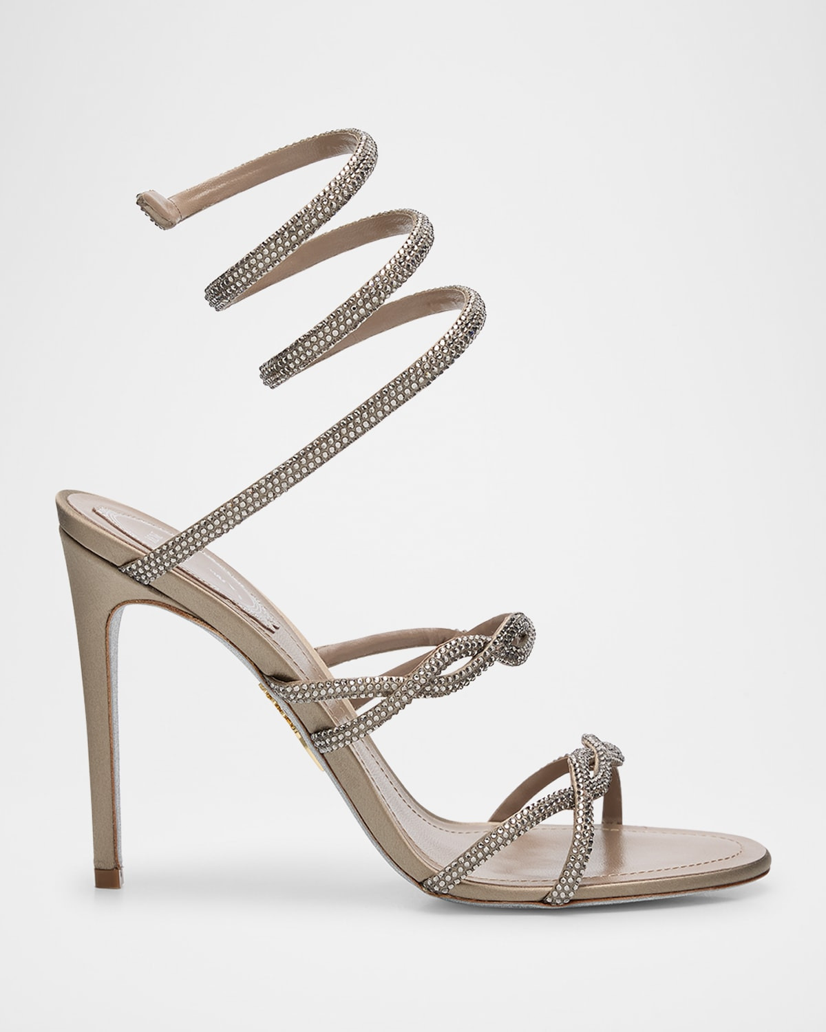 - Rene Caovilla strappy sandals in strass embellished viscose and silk satin - 4.25 in / 105 mm stiletto heel - Open toe - Braided dual-band upper - Signature spiral snake-wrap ankle strap - Signature glitter leather outsole - Goat leather, lining - Made in Italy