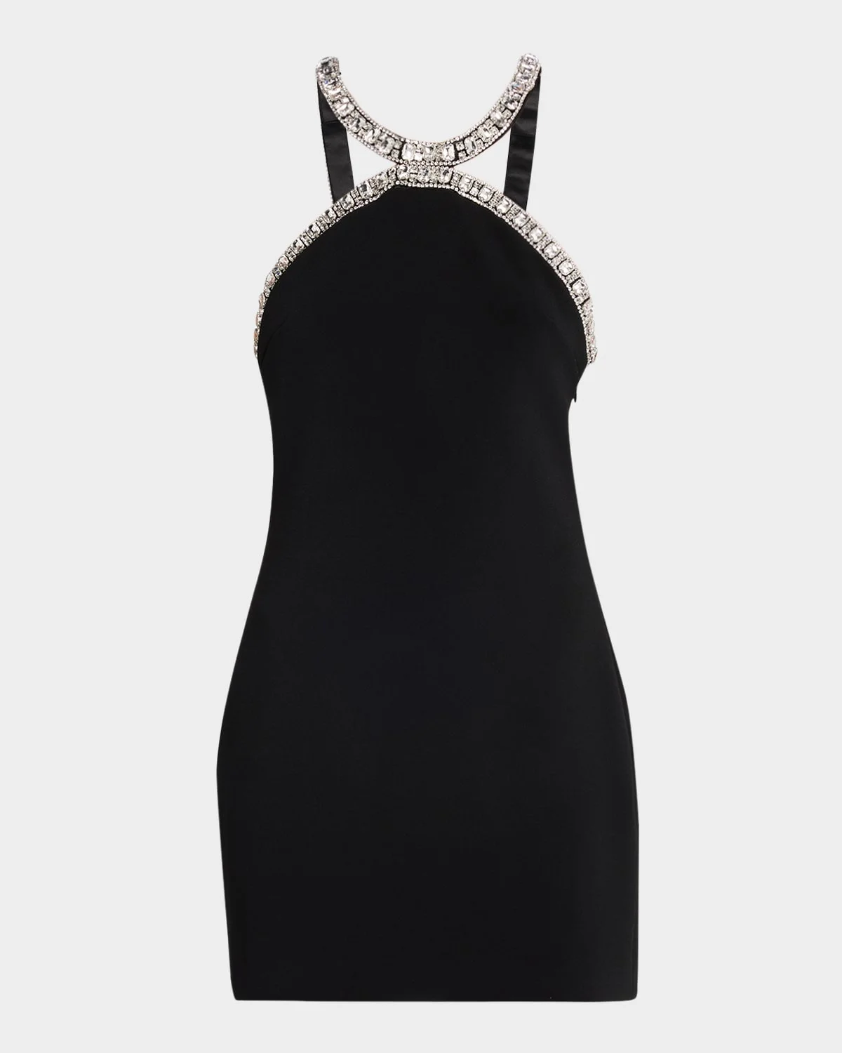 Adorned with crystalembellished straps, the "Ailsa" mini dress by Retrofete boasts a classic silhouette with a touch of shimmer and shine. Halter neckline Sleeveless Fitted silhouette Hem falls above the knee Zip closure Polyester Imported