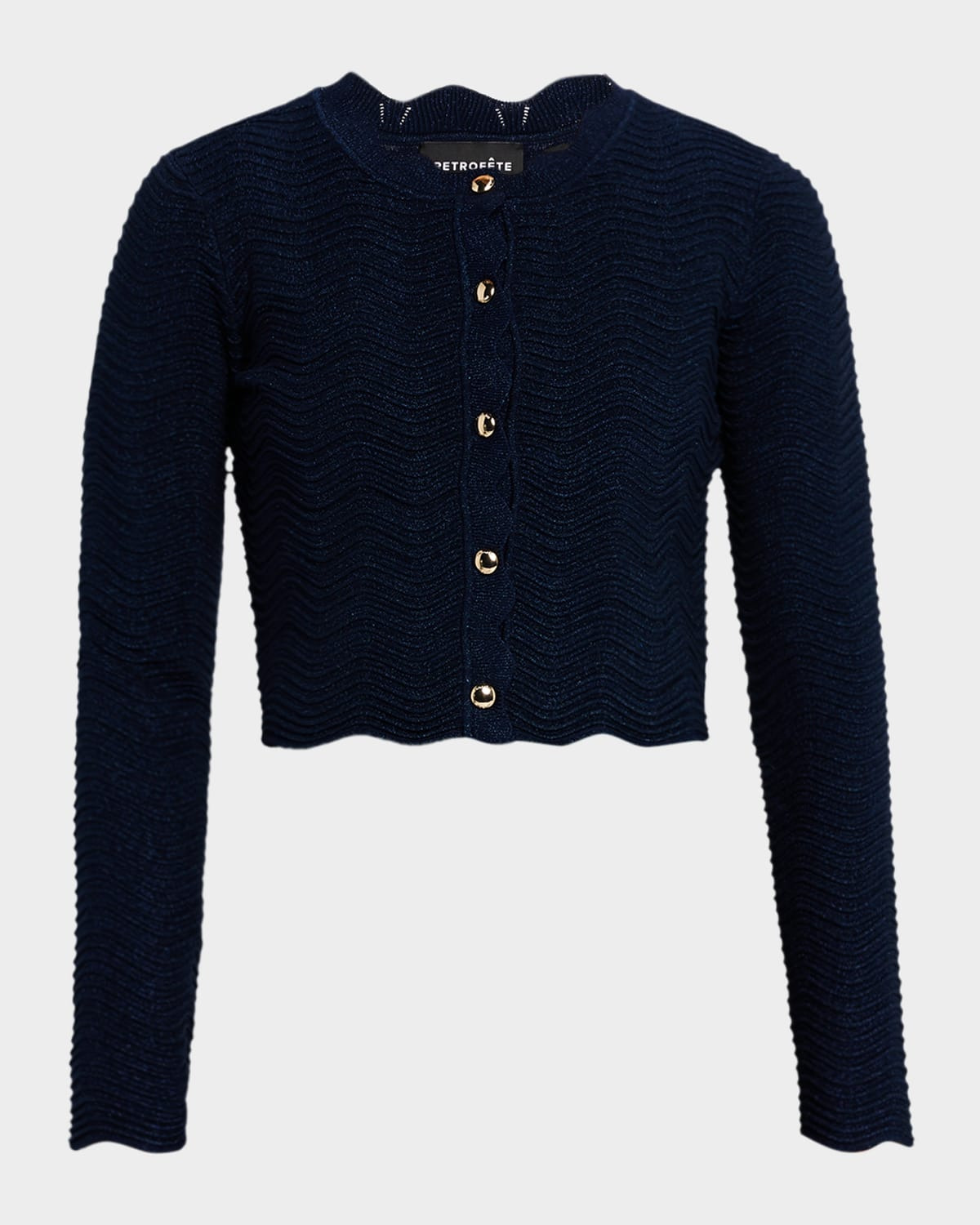 Retrofete "Dallys" sparkly knit cardigan finished with wavy trim Crew neckline Long sleeves Cropped fit Buttonfront Rayon/cellulose acetate/nylon/polyamide/spandex Dry clean Imported