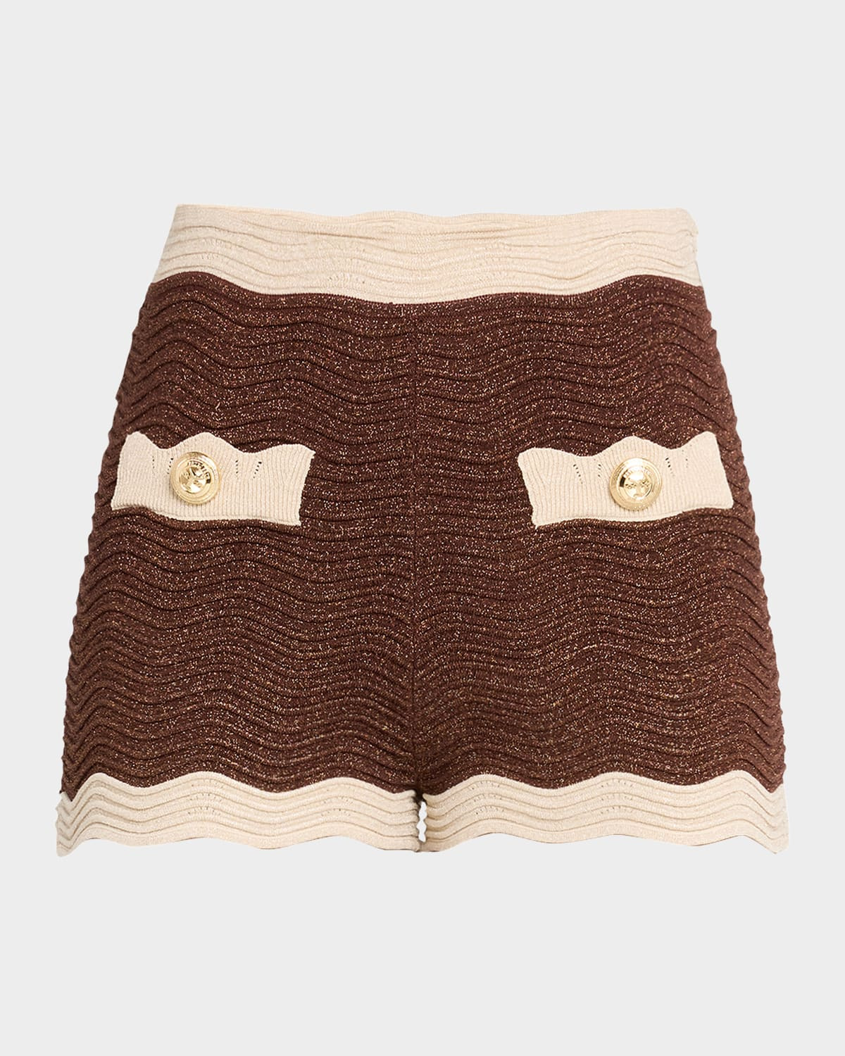 - Retrofete "Kait" sparkly knit micro shorts finished with scalloped trim - Mid-rise; sits high on the hip - Elastic waistband - Buttoned welt pockets - Fitted - Pull-on style - Rayon/cellulose acetate/nylon/polyamide/spandex - Dry clean - Imported