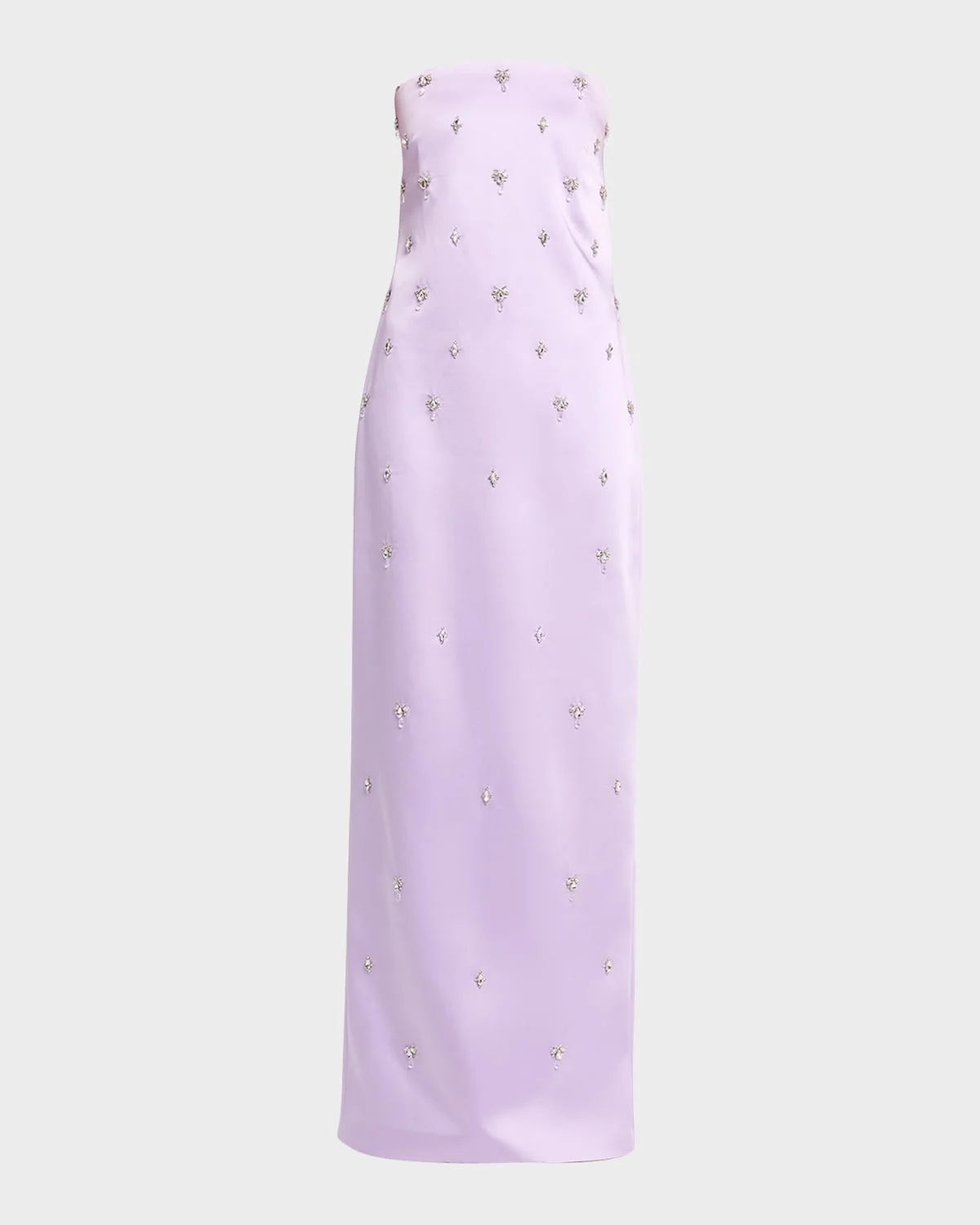 Accented with shimmering crystal-embellishment, the "Keziah" dress by Retrofete is cut from lustrous satin and showcases a sleek & nbsp;silhouette that exudes elegance. Strapless neckline Sleeveless Column silhouette Full length; center back vent & nbsp; Invisible back zip & nbsp; Polyester/rayon/cellulose acetate Dry clean Imported